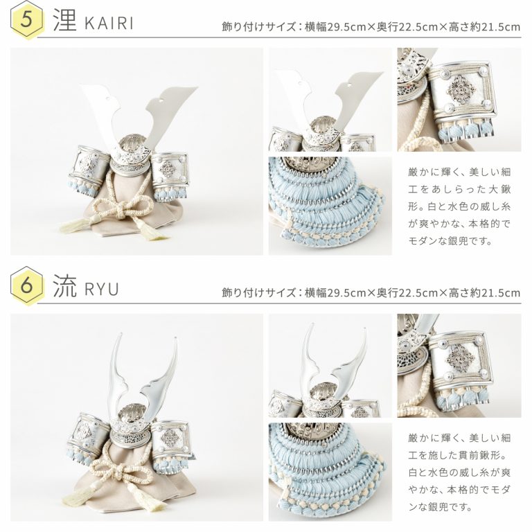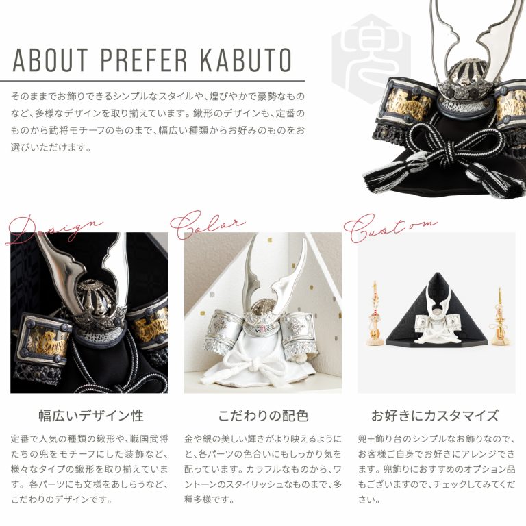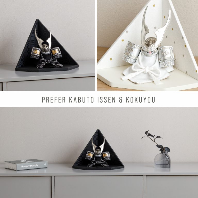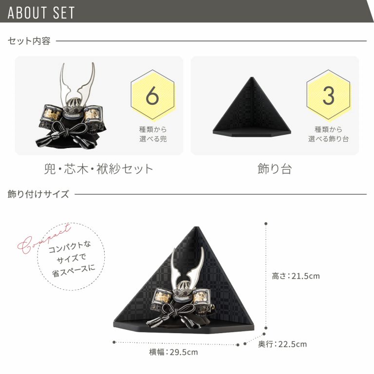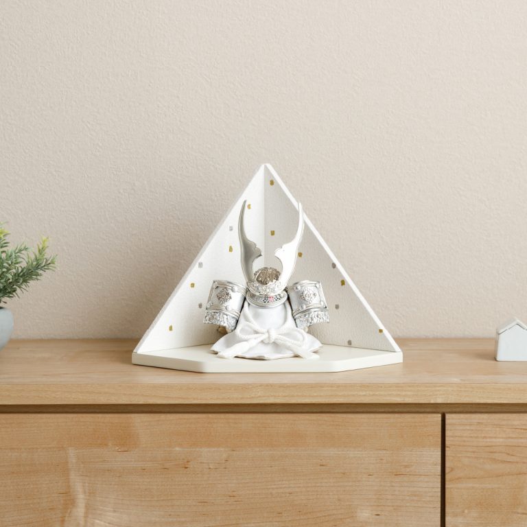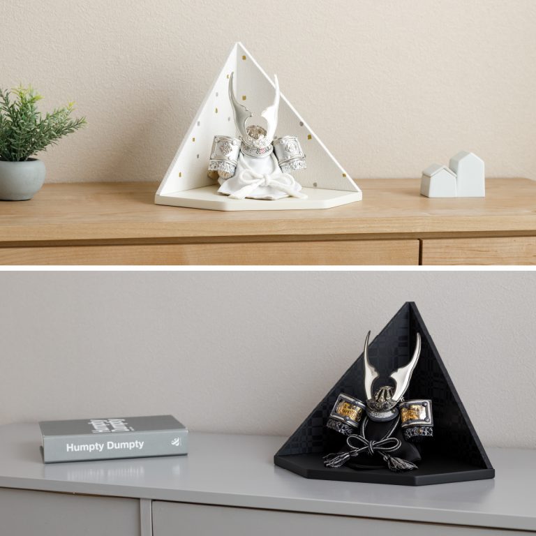 繊細な作りと華やかさを兼ね備えた重厚感のあるコンパクトな兜飾り。伊達政宗や上杉謙信、徳川家康など名だたる武将の兜をモチーフにしたものや勇ましい鍬形の前立など、大切なお子様の健やかな成長を願う五月人形にぴったりの節句飾りです。ダイヤ形の飾り台には、和紙を使用して仕立てたモダンな屏風を合わせました。よいやみ・ゆきぼし・うすぐもの3種類からお選びいただけます。兜と調和するシンプルで気品溢れるデザイン。初節句・端午の節句のお祝いやインテリアとしてもおすすめです。