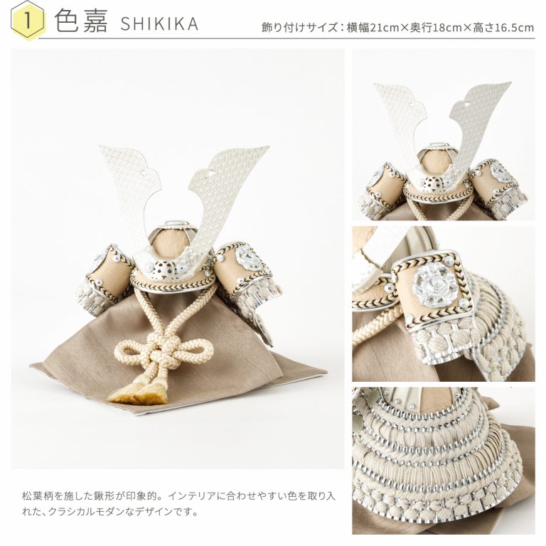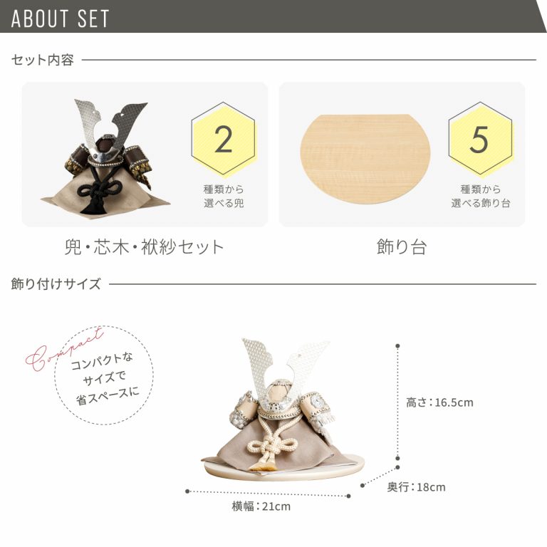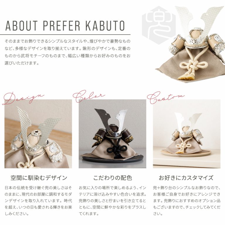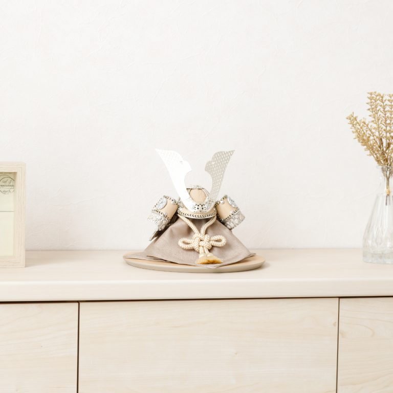 ベージュやブラウンといった、お部屋に溶け込む色合いのコンパクトなインテリア兜飾り。モダンな空間にも合うおしゃれなデザインと、勇ましさの両立を追求した五月人形です。半月を連想させるようなロマンチックな飾り台は、お部屋や兜飾りに合わせて5種類から選べます。シンプルモダンなフォルムで、五月人形そのものの美しさを存分に楽しむことができます。小さいサイズの節句飾りは、省スペースで飾れるのも魅力です。こどもの日や端午の節句に華を添える、ぷりふあのかっこいい五月人形。初節句のお祝いギフトにもおすすめです。