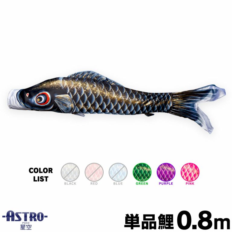 アストロは吹流しに黒鯉・赤鯉・青鯉が基本のセットで、さらに子鯉の緑鯉・紫鯉・ピンク鯉と全部で6色の鯉をご用意しております。ご家庭の家族構成にあったセットをお選びいただけます。また、お子様が増えても子鯉の追加は出来ますのでご安心ください。鯉のデザインは基本的に同じですが、サイズが小さくなるとかわいくデフォルメされたデザインとなっています。小さな鯉でも目玉の部分はシールではなく金箔染めで、鱗のぼかしも同じように入っていて細部にまでこだわっています。