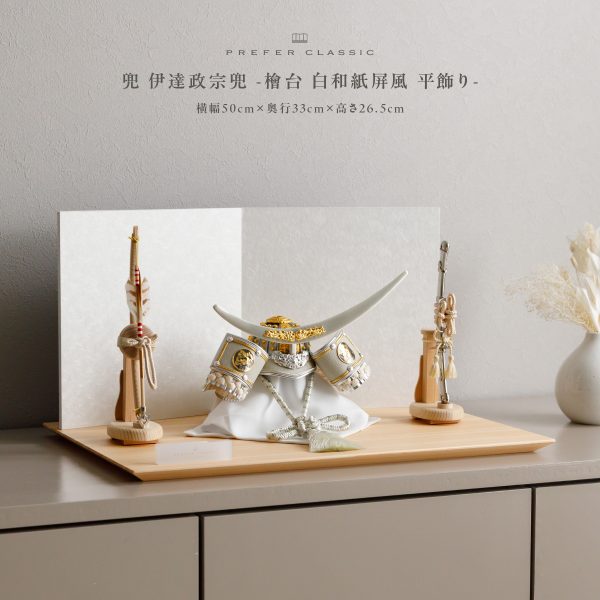 PREFER CLASSIC 五月人形[檜台 白和紙屏風 平飾り 弓太刀 白珠8号 伊達政宗兜]