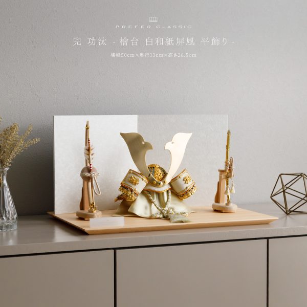 PREFER CLASSIC 五月人形[檜台 白和紙屏風 平飾り 弓太刀 白珠8号 功汰]