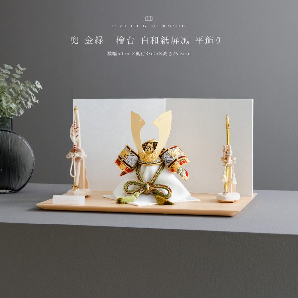 PREFER CLASSIC 五月人形[檜台 白和紙屏風 平飾り 弓太刀 白珠8号 金緑]