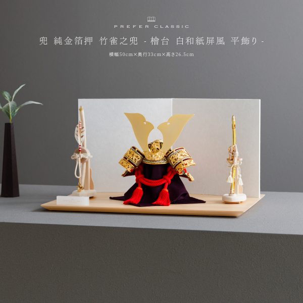 PREFER CLASSIC 五月人形[檜台 白和紙屏風 平飾り 弓太刀 白珠8号 純金箔押 竹雀之兜]