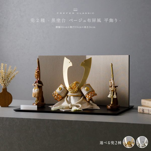 PREFER CLASSIC 五月人形[黒塗台 ベージュ布屏風 平飾り 弓太刀 大和 天輝 律輝]