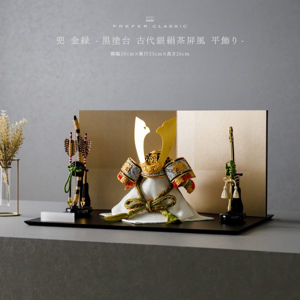 PREFER CLASSIC 五月人形[黒塗台 古代銀絹茶屏風 平飾り 弓太刀 山代8号 金緑]