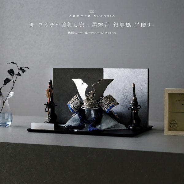 PREFER CLASSIC 五月人形[黒塗台 シルバー屏風 平飾り 弓太刀 黒龍5号 プラチナ箔押し兜]