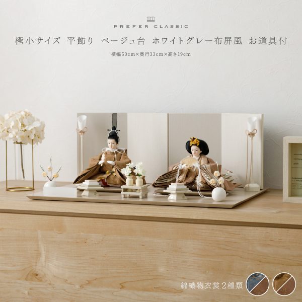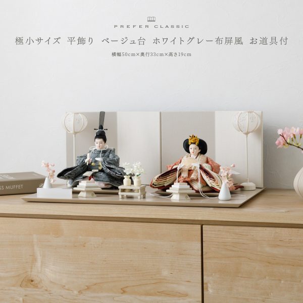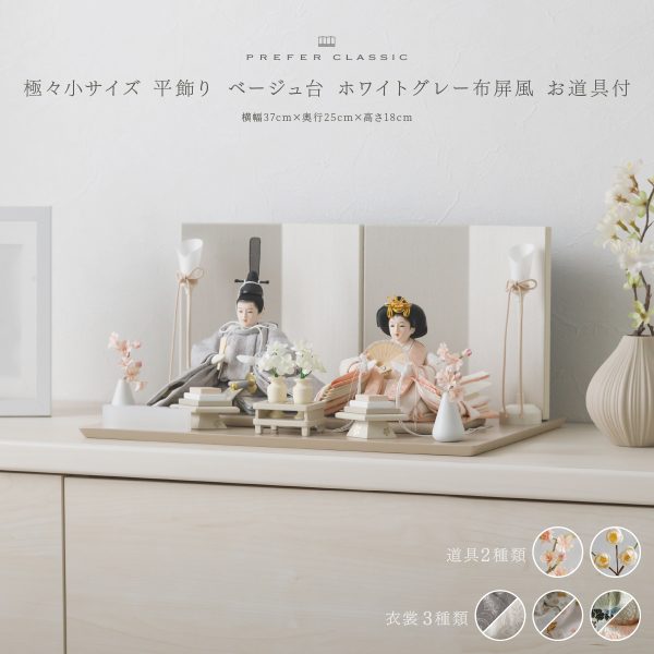 PREFER CLASSIC ひな人形 [ベージュ台 ホワイトグレー屏風 平飾り お道具付 菱餅三方 油灯 白梅 人形極小サイズ 選べる綿織物衣裳2種類 小夜 耶子]