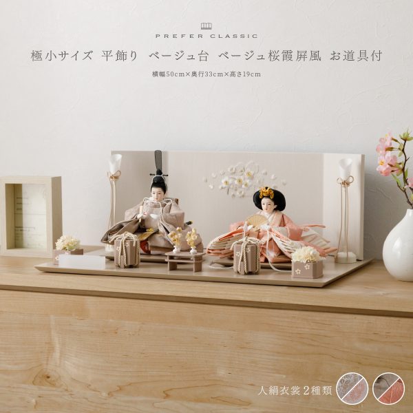 PREFER CLASSIC ひな人形 [ベージュ台 ベージュ桜霞屏風 平飾り お道具付 貝桶花 油灯 人形極小サイズ 選べる人絹衣裳2種類 和叶 詠華]