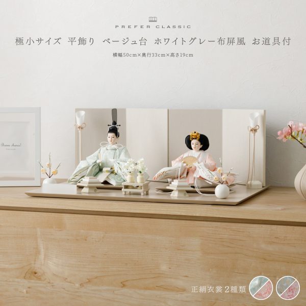 PREFER CLASSIC ひな人形 [ベージュ台 ホワイトグレー屏風 平飾り お道具付 菱餅三方 油灯 白梅 人形極々小サイズ 選べる人絹衣裳2種類 縁路 月城]