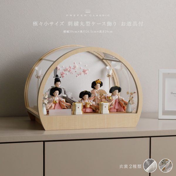 PREFER CLASSIC ひな人形 [丸型ケース飾り お道具付 菱餅三方 油灯 桜橘 人形極々小サイズ 選べる衣裳4種類 郁乃 澄葉 優白 千景]