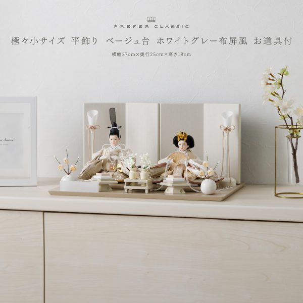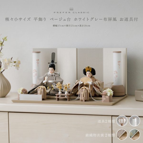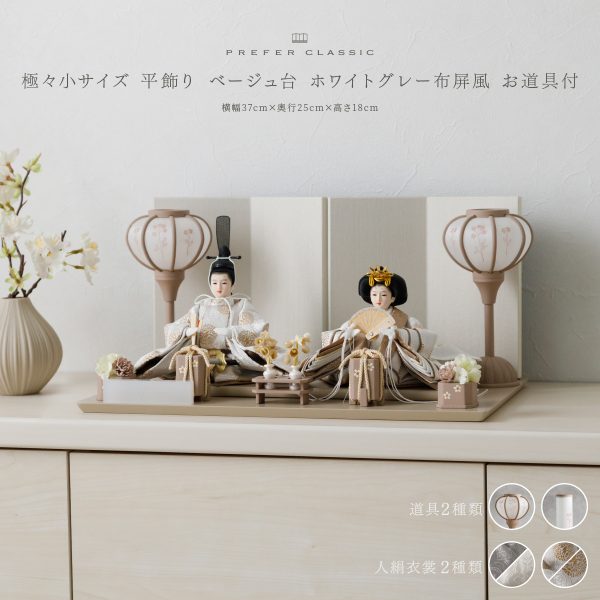 PREFER CLASSIC ひな人形 [ベージュ台 ホワイトグレー屛風 平飾り お道具付 菱餅三方 油灯 白梅 人形極々小サイズ 人絹衣裳 陽亜]