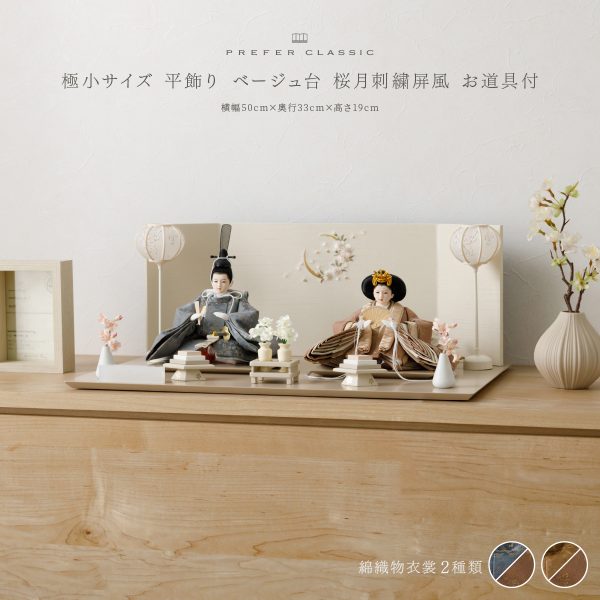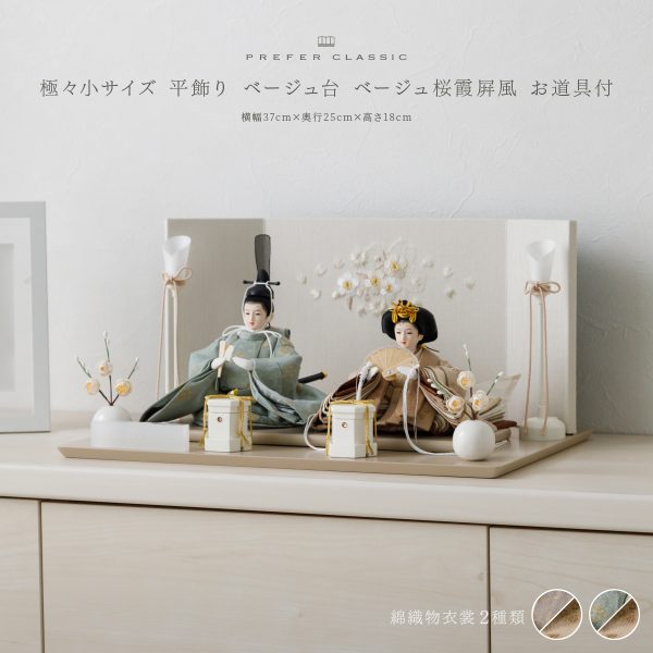 PREFER CLASSIC ひな人形 [ベージュ台 桜霞屏風 平飾り お道具付 貝桶 油灯 白梅 人形極々小サイズ 選べる綿織物衣裳2種類 楚那 梨未]