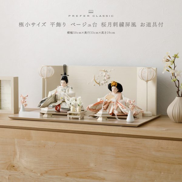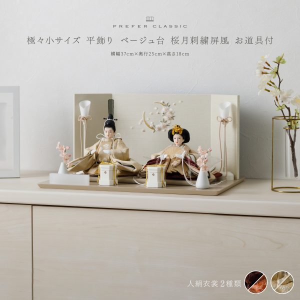 PREFER CLASSIC ひな人形 [ベージュ台 桜月刺繍屏風 平飾り お道具付 貝桶 油灯 枝桜ピンク 人形極々小サイズ 選べる人絹衣裳2種類 縁路 月城]