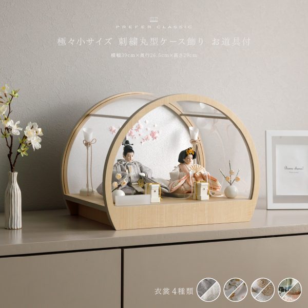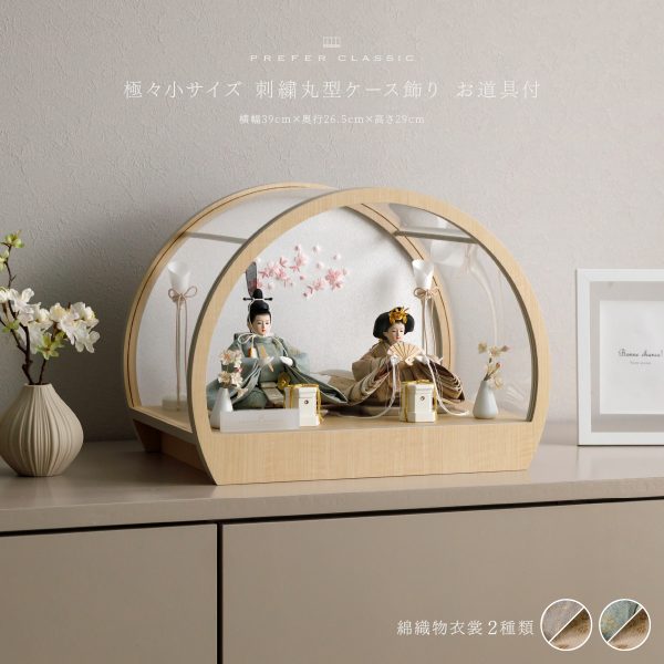 PREFER CLASSIC ひな人形 [丸型ケース飾り お道具付 貝桶三方 油灯 白梅 人形極小サイズ 選べる人絹衣裳5種類 和叶 蔦代 詠華 沙結 此果]
