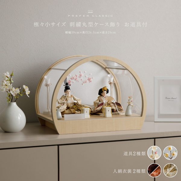 PREFER CLASSIC ひな人形 [丸型ケース飾り お道具付 貝桶 油灯 選べる道具2種 枝桜白 白梅 人形極々小サイズ 選べる人絹衣裳2種類 縁路 月城]