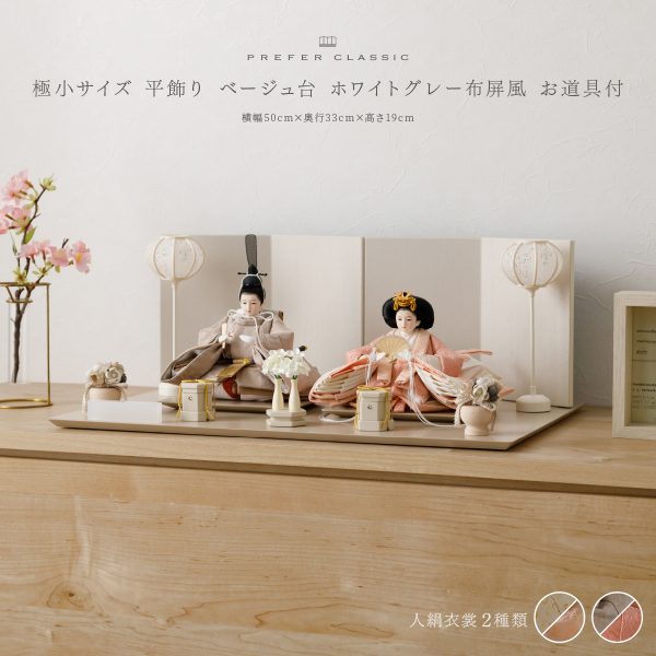 PREFER CLASSIC ひな人形 [ベージュ台 ホワイトグレー屏風 平飾り お道具付 菱餅三方 雪洞 枝桜ピンク 人形極小サイズ 選べる正絹衣裳2種類 桃帯 深紗]