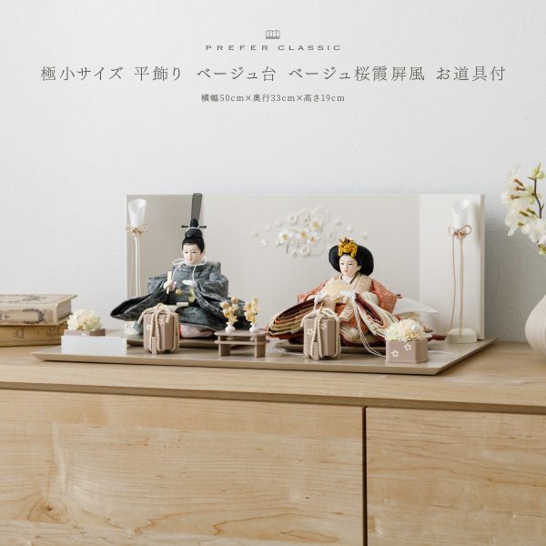 PREFER CLASSIC ひな人形 [ベージュ台 桜霞屏風 平飾り お道具付 貝桶花 油灯 人形極小サイズ 人絹衣裳 玖恩]