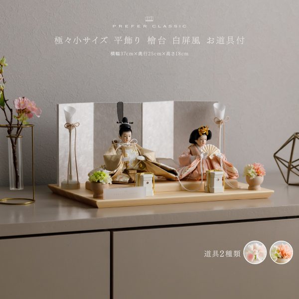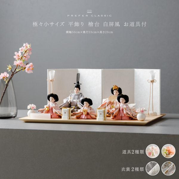 PREFER CLASSIC ひな人形 [檜台 白屏風 平飾り お道具付 貝桶 油灯 選べる道具2種類 枝桜ピンク 白梅 人形極々小サイズ 選べる衣裳4種類 澄葉 郁乃 優白 千景]