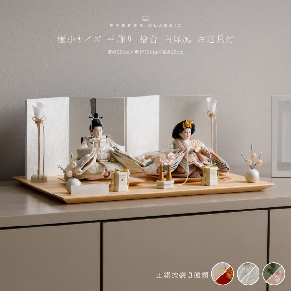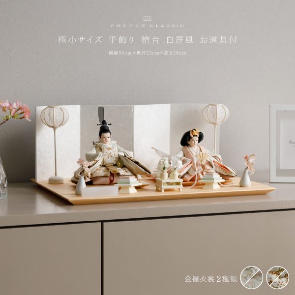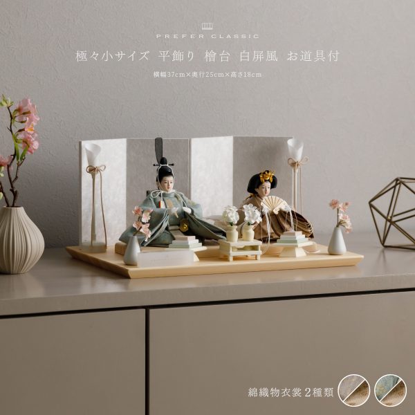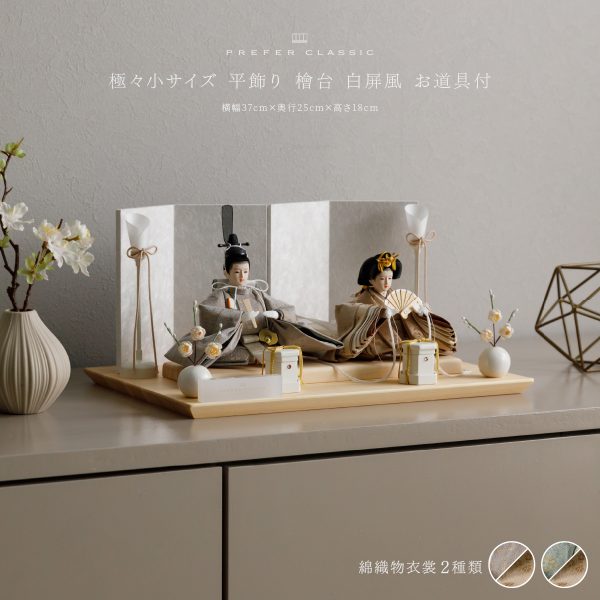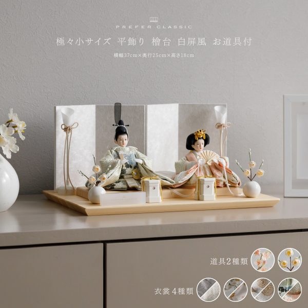 PREFER CLASSIC ひな人形 [檜台 白屏風 平飾り お道具付 貝桶 油灯 白梅 人形極々小サイズ 選べる綿織物衣裳2種類 楚那 梨未]