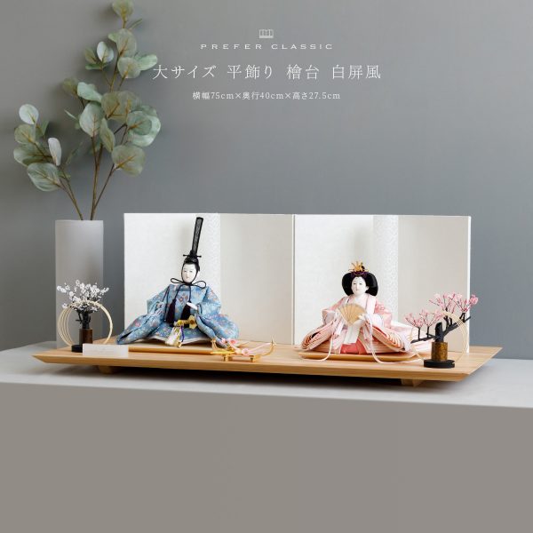 PREFER CLASSIC ひな人形 [檜台 白屏風 平飾り お道具付 和桜 貝桶 油灯 人形小サイズ 選べる金襴衣裳3種類 煌咲 帆風 白帆]