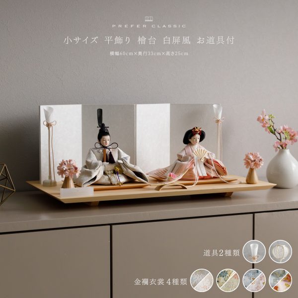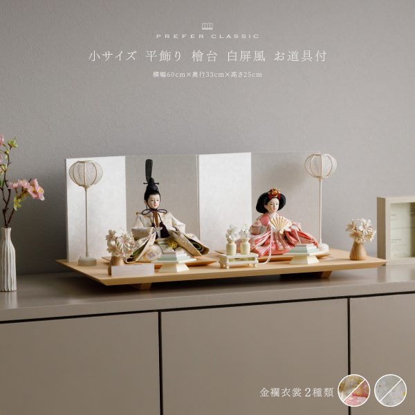 PREFER CLASSIC ひな人形 [檜台 白屏風 平飾り お道具付 貝桶 油灯 人形小サイズ 正絹衣裳 仰紅]