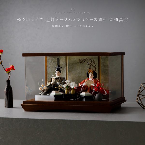 PREFER CLASSIC ひな人形 [点灯オークパノラマケース飾り お道具付 菱餅三方 紅白梅 人形極々小サイズ 金襴衣裳 華衣]