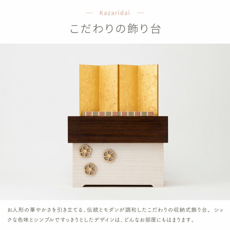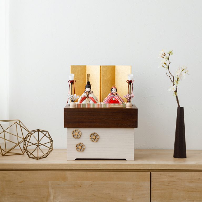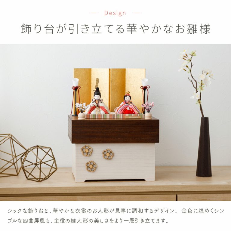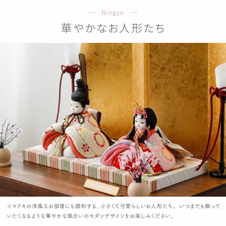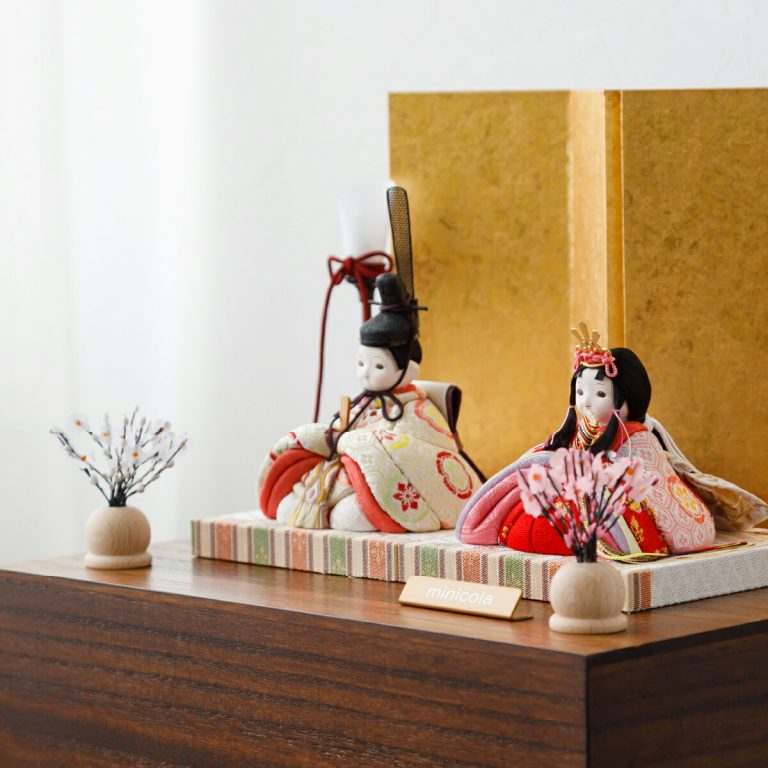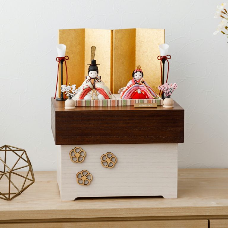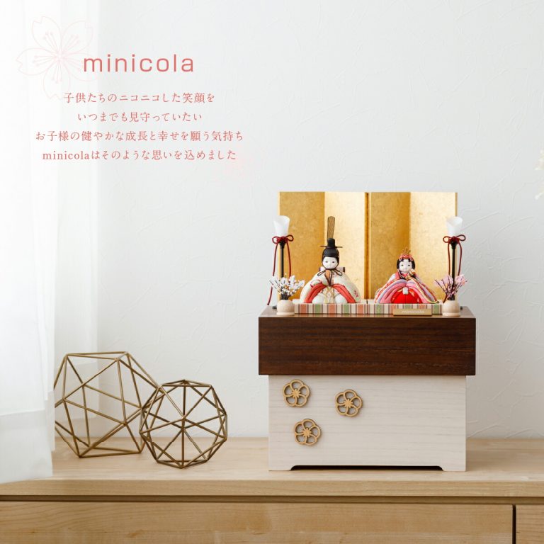 おめでたい初節句にぴったりな、かわいい表情のminicolaの手のひらサイズの小さい雛人形。収納スペース付きのモダンな飾り台と、シンプルな金屏風がお雛様を華やかに彩ります。おしゃれな雰囲気のミニコラのひな飾りはプレゼントにもおすすめです。コンパクトサイズのおひな様なので、可愛いインテリアとしてもお楽しみいただけます。