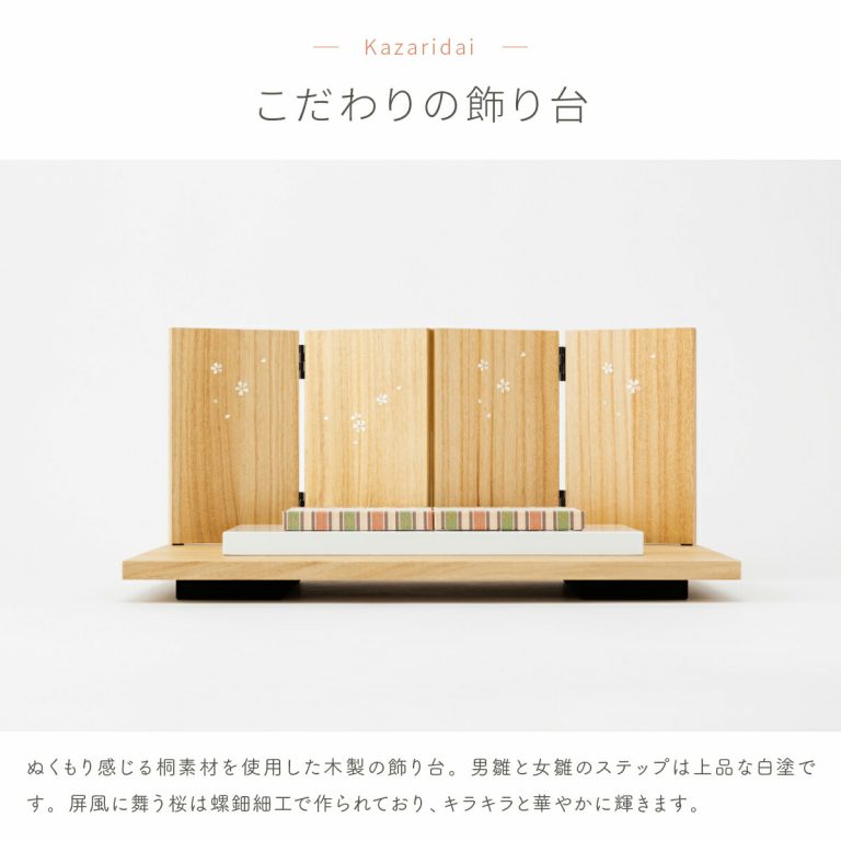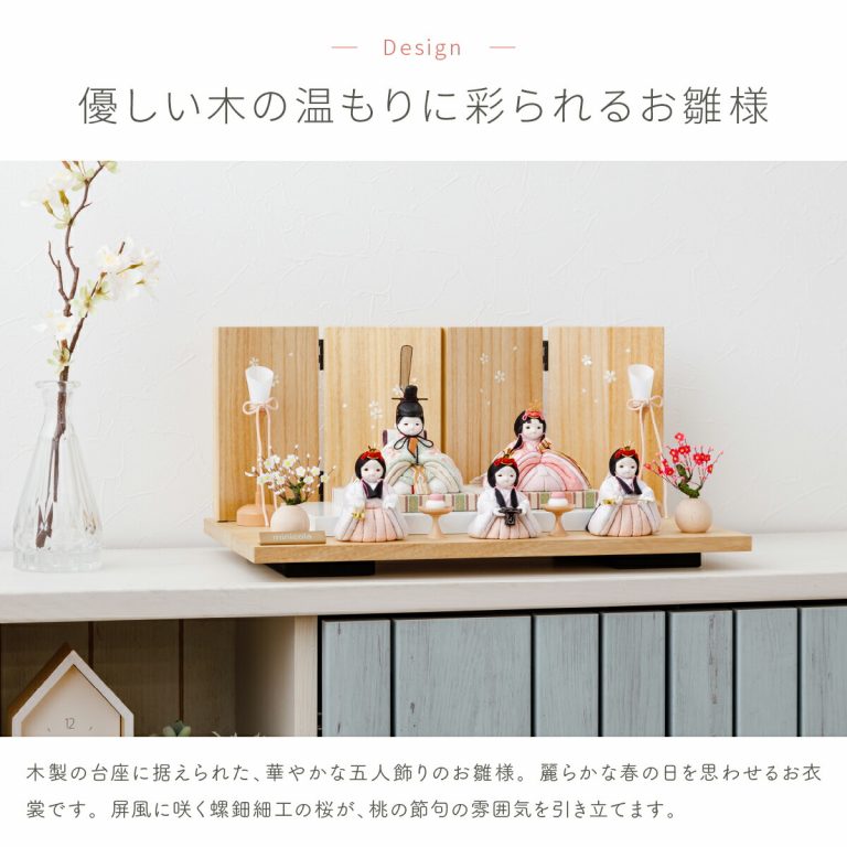 かわいいお顔に癒されるminicolaの手のひらサイズの小さい雛人形。木製のモダンな飾り台や、可愛い桜の舞う屏風が5人飾りのお雛様を華やかに彩ります。優しい雰囲気のミニコラのひな飾りはおめでたい日にぴったり。初節句だけでなく、プレゼントにもおすすめのおひな様です。コンパクトサイズなのでおしゃれなインテリアとしてもお楽しみいただける、五人飾りのひな人形です。
