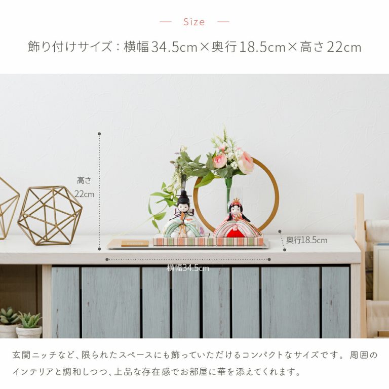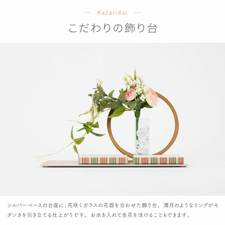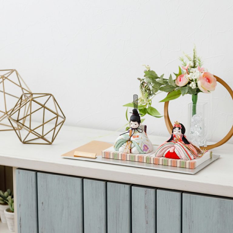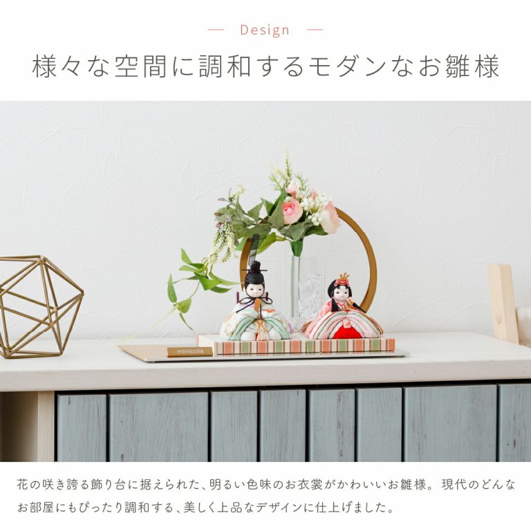 おめでたい初節句にふさわしい、minicolaの手のひらサイズの小さい雛人形です。シックな台座と、お花が溢れるガラス製の花器を合わせた飾り台は、どんなお部屋にも合うモダンなデザイン。かわいいお雛様を一層華やかに引き立てます。おしゃれな雰囲気のミニコラのひな飾りはプレゼントにもおすすめです。飾りやすいコンパクトサイズのおひな様なので、可愛いインテリアのように飾っていただけます。
