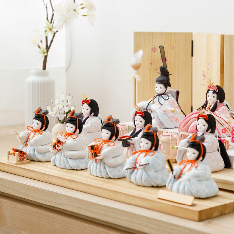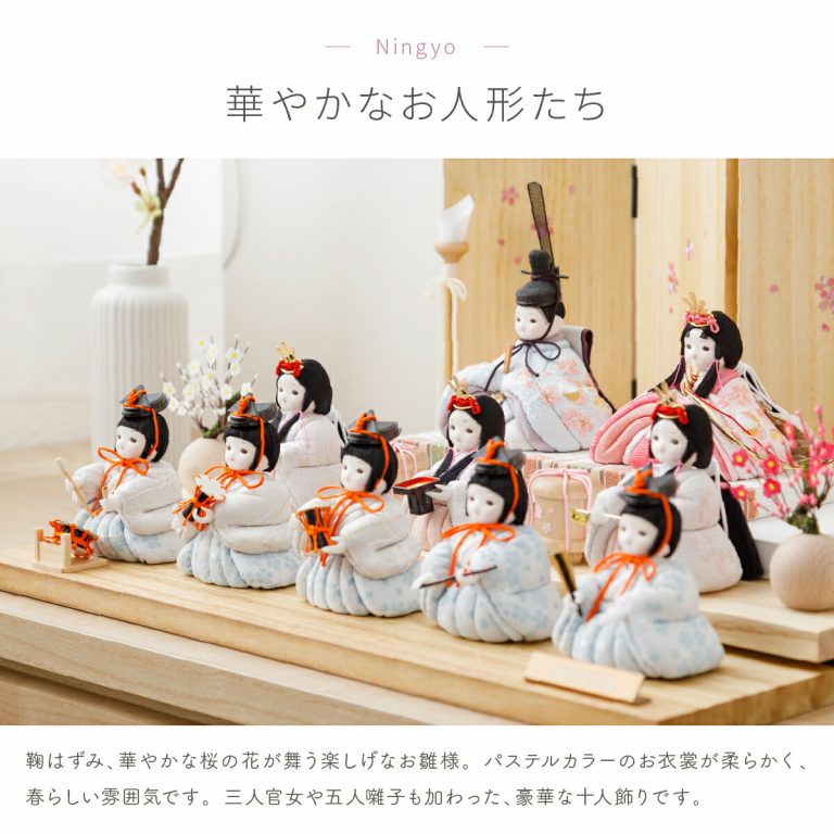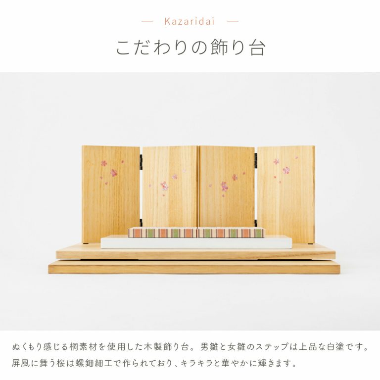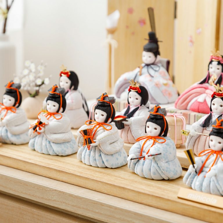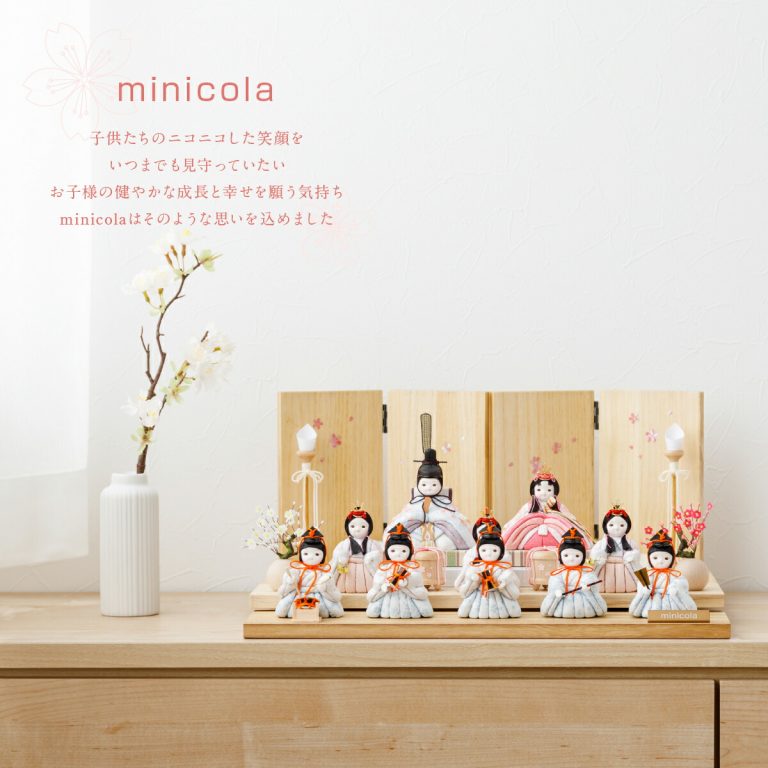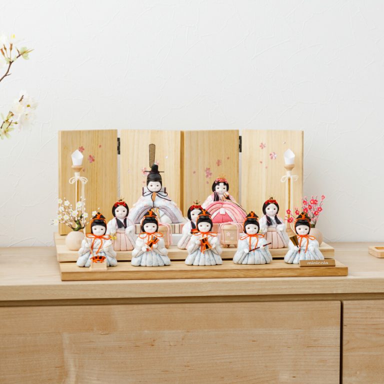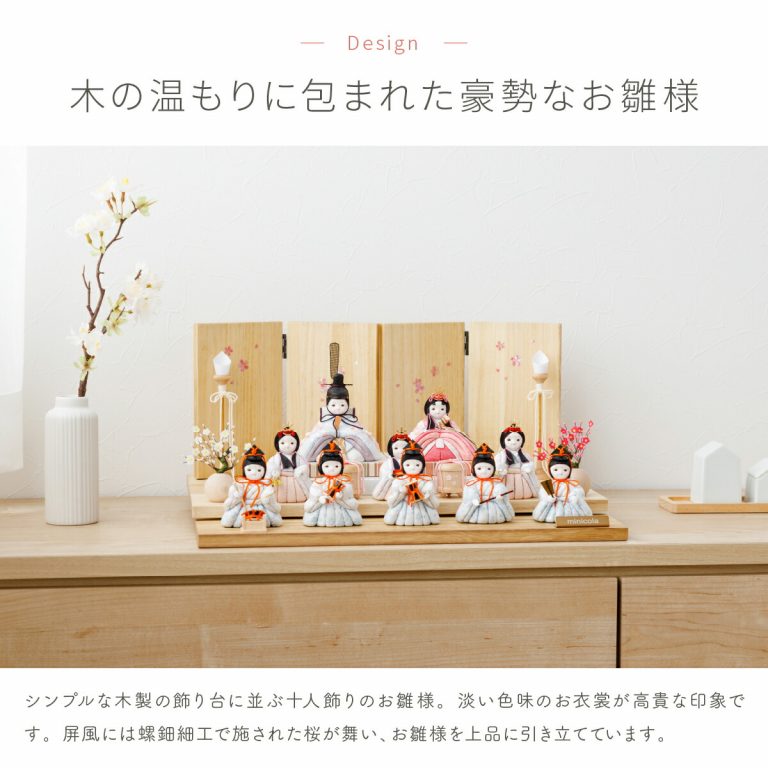 かわいい表情に癒される、minicolaの手のひらサイズの小さい雛人形。ぬくもりを感じる木製のモダンな飾り台や、螺鈿細工の可愛い桜の舞う屏風が10人のお雛様を華やかに彩ります。優しい雰囲気のミニコラのひな飾りは、おめでたい初節句にぴったり。プレゼントにもおすすめです。コンパクトサイズの十人飾りのおひな様なので、インテリアとしてもおしゃれに飾っていただけます。