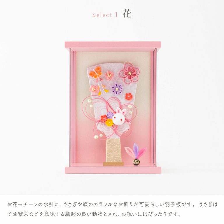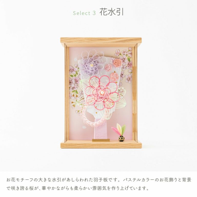 はんなりかわいい6号羽子板飾り。デザインは、花・花つまみ・花水引の3種類から選べます。アクリルケース入りなので、ホコリや傷から羽子板を守ってくれます。初正月にもぴったりの、モダンでおしゃれな雰囲気をまとった羽子板。お雛様と一緒に飾ると良いとされており初節句にもおすすめです。コンパクトなので飾る場所を選びません。