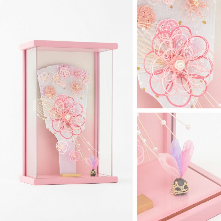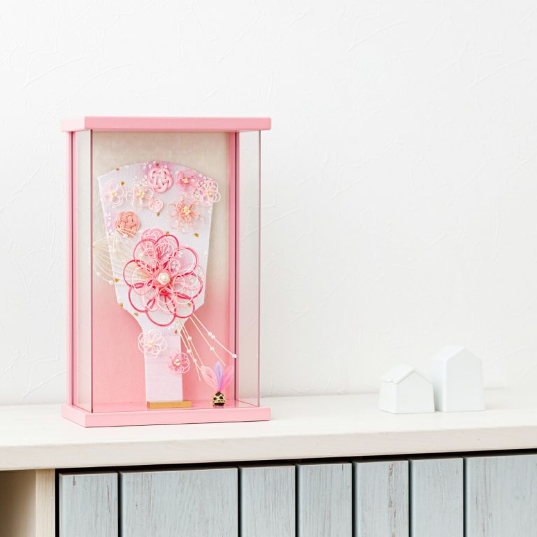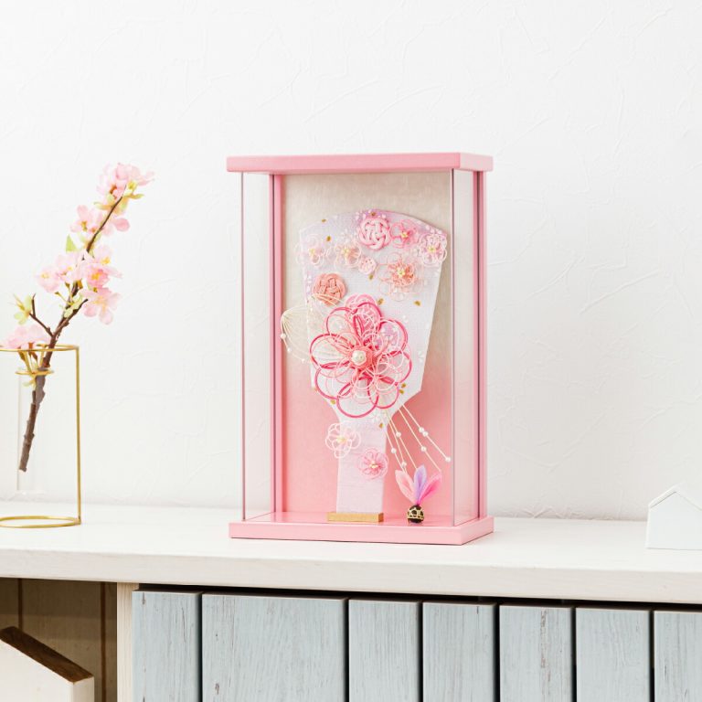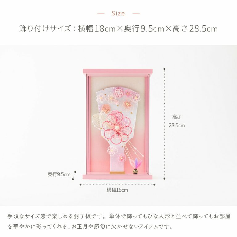 ピンク色を基調としたかわいい8号羽子板飾り。アクリルケース入りでホコリや傷から羽子板を守ってくれるため、美しい状態を長くお楽しみいただけます。初正月にもぴったりの、モダンでおしゃれな雰囲気をまとった羽子板。羽子板はお雛様と一緒に飾ると良いとされており、初節句にもおすすめです。手頃な大きさで、お部屋を一層華やかに彩ってくれます。