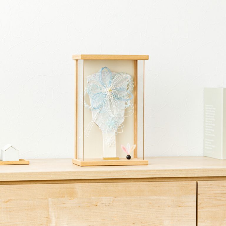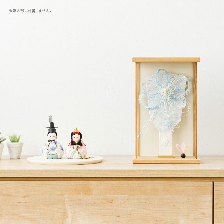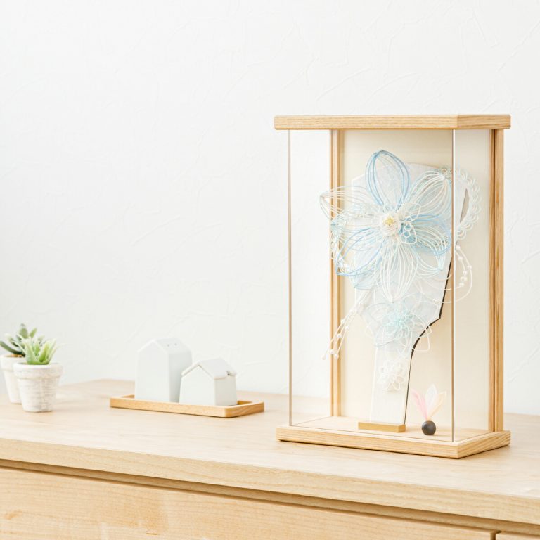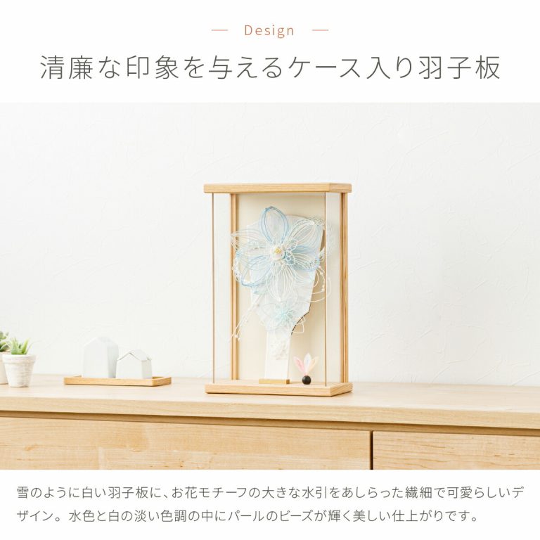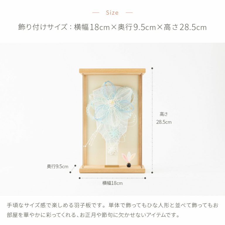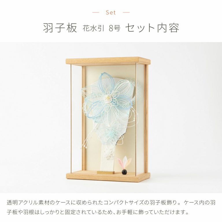 白と水色でかわいいお花の水引をあしらった8号羽子板飾り。おめでたい初正月や正月飾りにぴったりの、モダンでおしゃれなデザインに仕上げました。ホコリや傷から守ってくれるアクリルケース入りです。羽子板はお雛様と一緒に飾ると良いとされており、可愛いお子様の初節句にもおすすめです。インテリアのように飾れる手頃な大きさで、特別な日を一層華やかに演出してくれます。