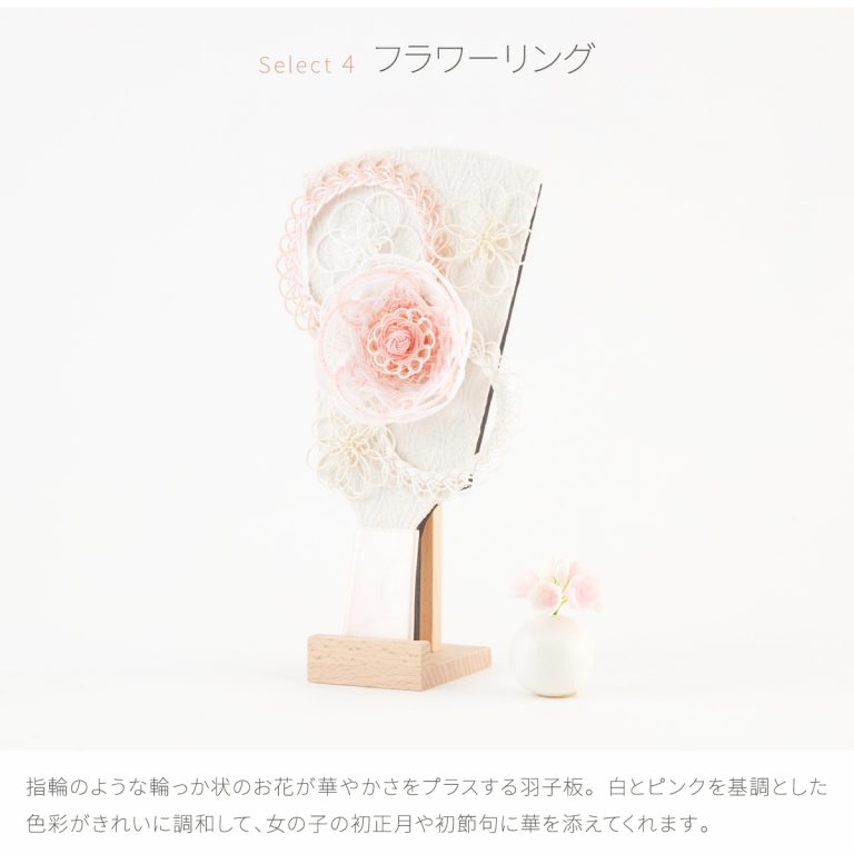 かわいいデザインでインテリアに調和する、コンパクトな6号羽子板飾り。お花やレースが、モダンでおしゃれな雰囲気を演出します。オプションでアクリルケース入りに変更可能です。羽子板はお雛様と一緒に飾ると良いとされており、初正月だけでなく、ひな祭りや初節句にぴったり。お祝いギフトにもおすすめです。