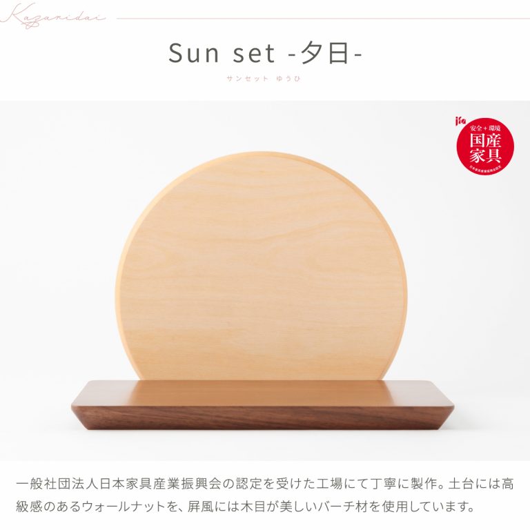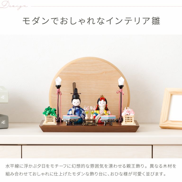 一般社団法人日本家具産業振興会認定の国産飾り台。水平線に浮かぶ夕日をモチーフに、木製の風合いを生かしたナチュラルでかわいい親王タイプのひな飾りです。飾り台にはウォールナット、屏風にはバーチ材を使用。木の温もりがひな人形を包み込む、落ち着きのあるブラウン系でまとめました。モダンでおしゃれな雰囲気を醸し出すインテリア雛人形です。小さいサイズにこだわっているのでコンパクトにお雛様を楽しんでいただけます。