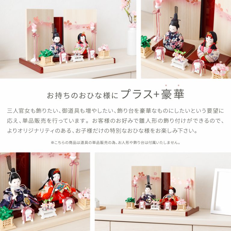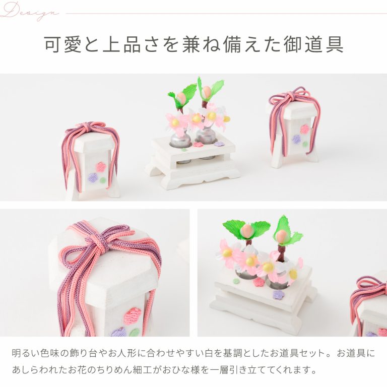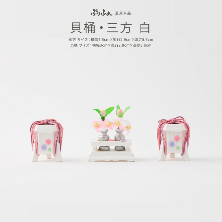 ぷりふあのおひな様を豪華に演出する単品のお道具たち。ひな飾りを華やかに彩る、白基調の貝桶と三方のセットです。人形に合わせてコンパクトなものをセレクトしました。ちりめん細工のかわいいお花が優美な雰囲気を引き立て、ひな祭りにいっそう華を添えてくれます。初節句のプチギフトにもぴったりです。