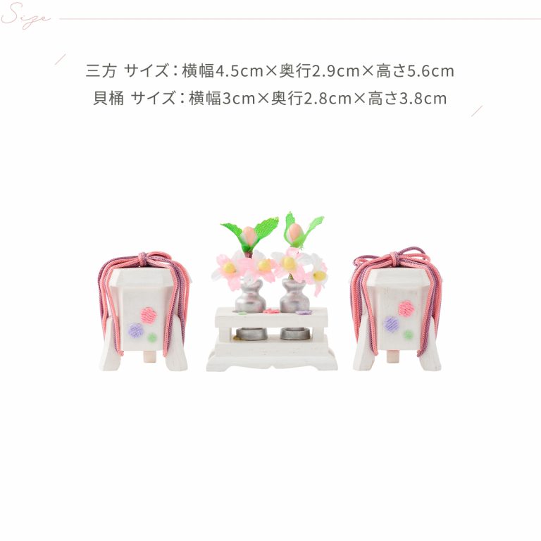 ぷりふあのおひな様を豪華に演出する単品のお道具たち。ひな飾りを華やかに彩る、白基調の貝桶と三方のセットです。人形に合わせてコンパクトなものをセレクトしました。ちりめん細工のかわいいお花が優美な雰囲気を引き立て、ひな祭りにいっそう華を添えてくれます。初節句のプチギフトにもぴったりです。