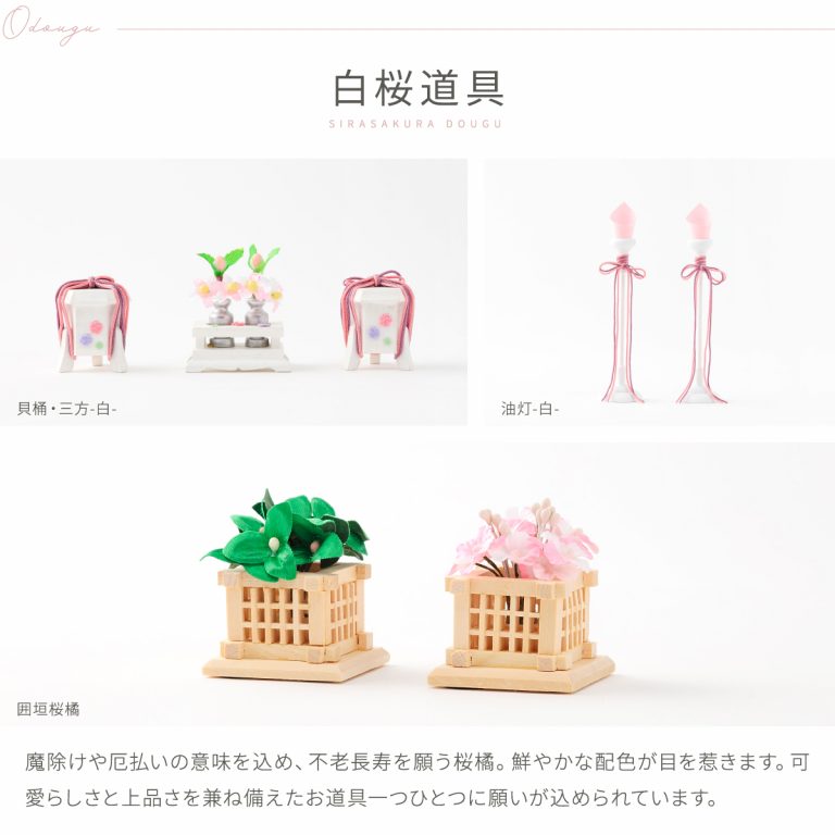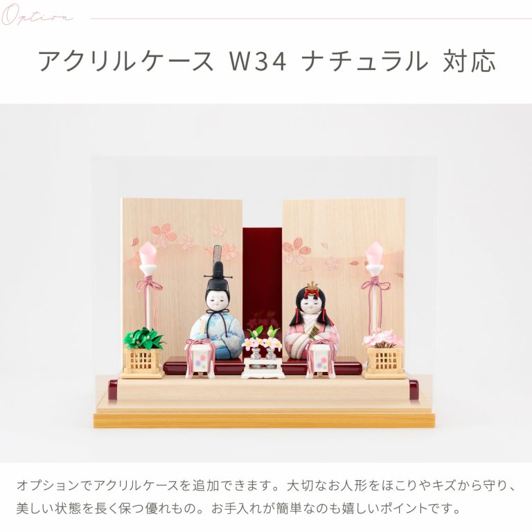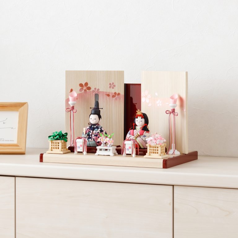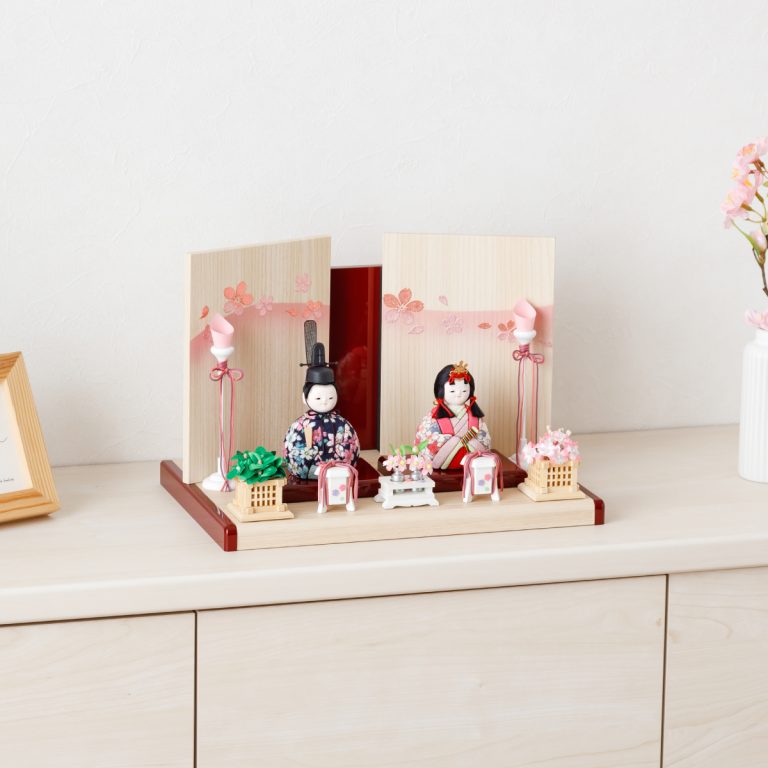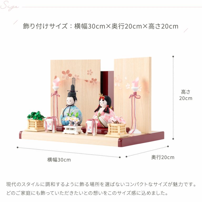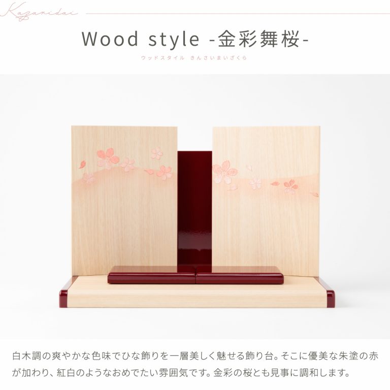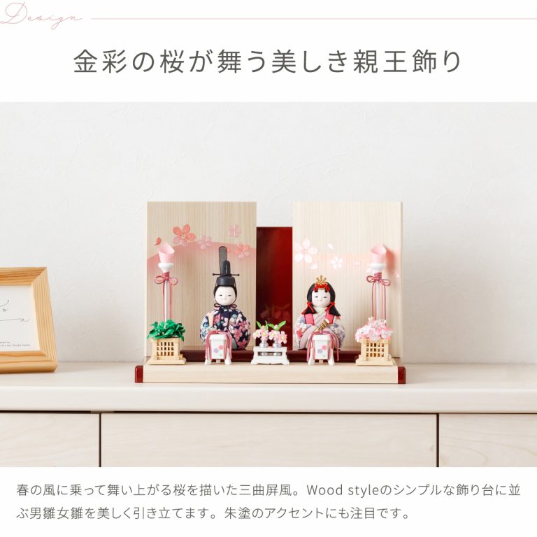 木目調がおしゃれでモダンな雰囲気のWood styleひな飾り。かわいい桜がふわりと舞い上がる様子を金彩であしらった屏風が雛人形を包みます。すっきりと爽やかな白木調の飾り台には可愛らしい朱塗のアクセント。紅白を思わせるおめでたい色合いで初節句にもぴったりです。小さいサイズ感で、お部屋のインテリアとしてもおすすめ。コンパクトなので飾る場所を選ばずおひな様を楽しめます。