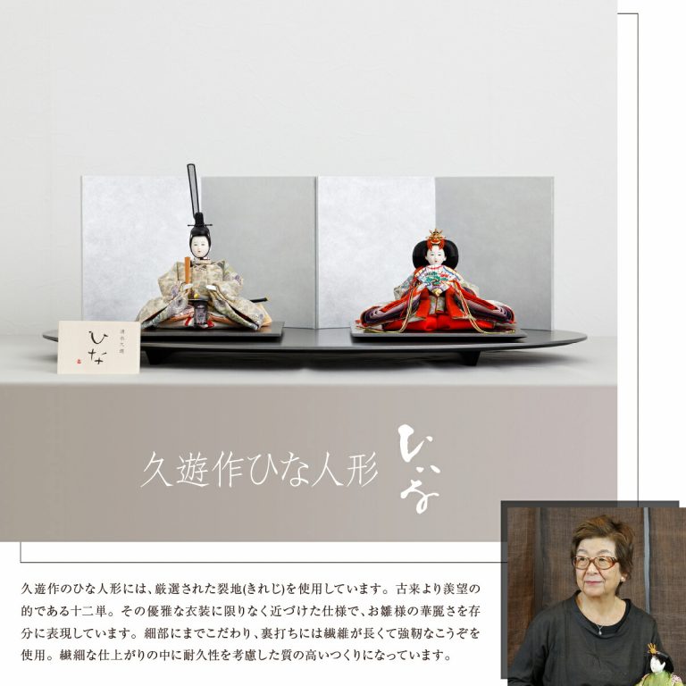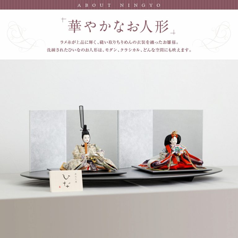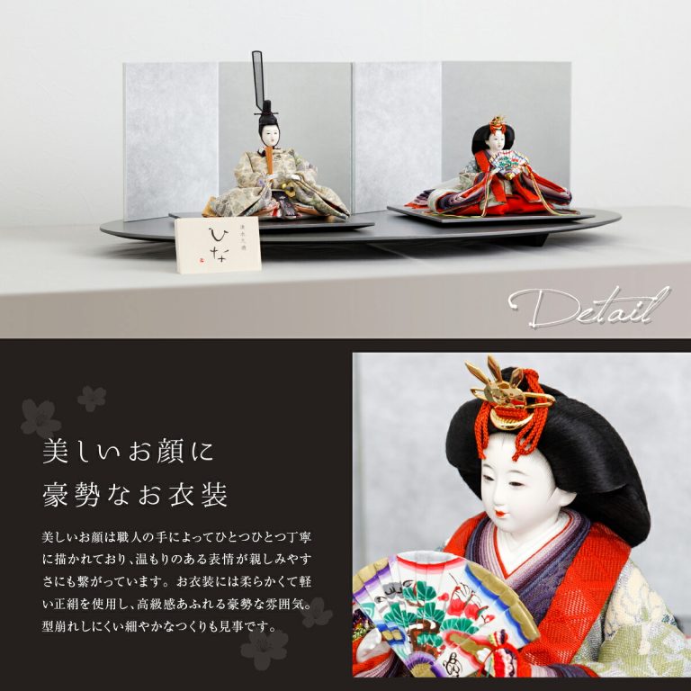 美しく繊細な姿が印象的な、清水久遊作の雛人形です。ラメ糸が上品に輝く、縫い取りちりめんのお衣装を纏った華やかな親王飾り。深い色合いのモダンな台座とシンプルな銀屏風が、かわいいお雛様を美しく彩ります。高貴な雰囲気のひいなのひな飾りは、可愛いお子様の初節句にぴったり。お祝いギフトにもおすすめです。場所を取らないコンパクトサイズのおひな様なので、おしゃれなインテリアとしてもお楽しみいただけます。