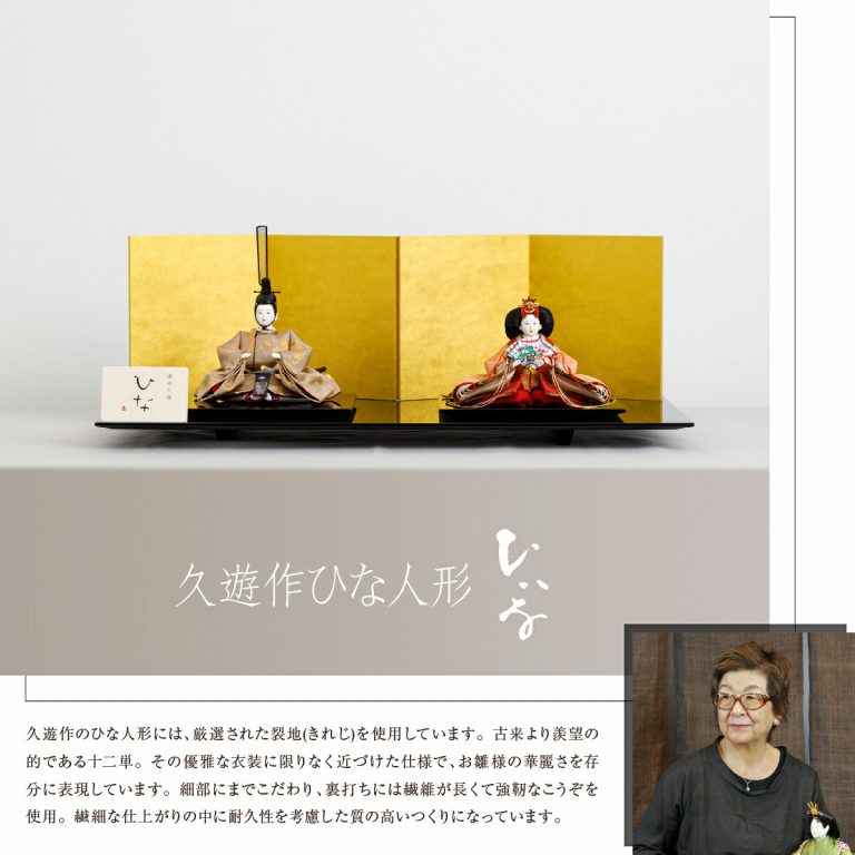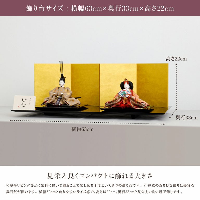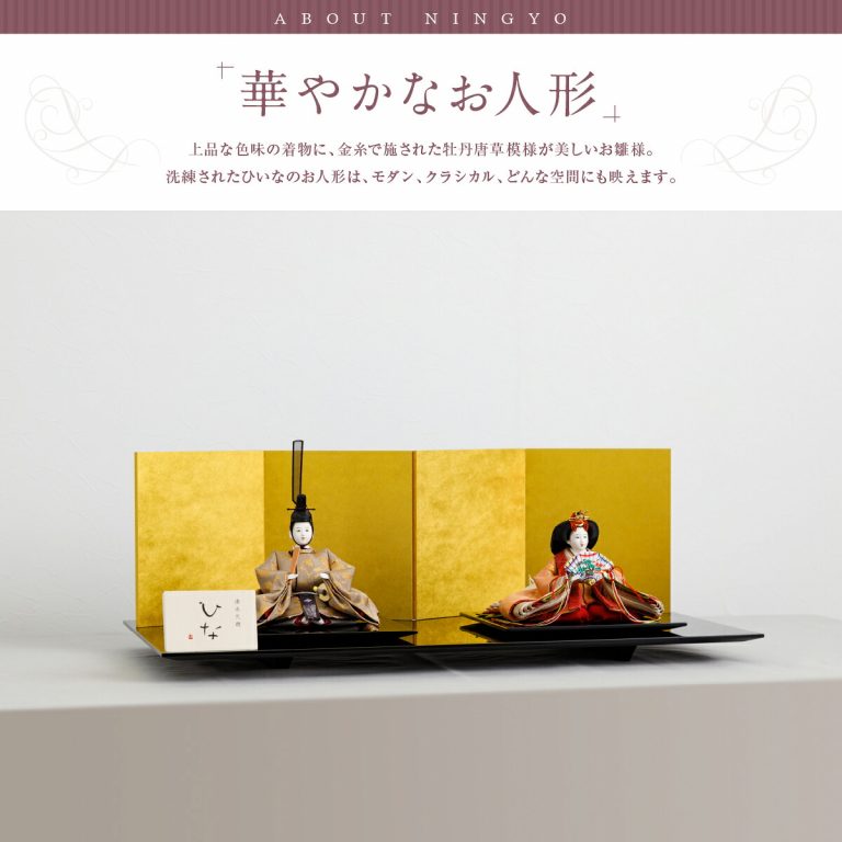 繊細で華麗な作品を生み出し続ける清水久遊作の雛人形。上品な牡丹唐草模様が美しい、雅やかな親王飾りです。艶やかに輝く黒塗の飾り台と煌めく金屏風が、かわいいお雛様を華やかに引き立てます。高貴な雰囲気のひいなのひな飾りは、おめでたい初節句にぴったり。お祝いギフトにもおすすめです。コンパクトサイズのおひな様なので、おしゃれなインテリアとしてもお楽しみいただけます。