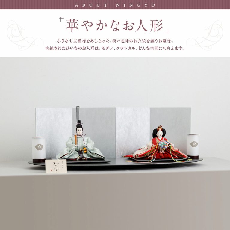 女流作家、清水久遊が生み出す美しく繊細な雛人形。かわいい七宝模様の衣装を纏ったお雛様を、行灯の光が優しく照らす優美な親王飾りです。モダンな飾り台と屏風がお雛様を美しく際立たせます。高貴な雰囲気のひいなのひな飾りはおめでたい日にぴったり。お子さまの初節句やお祝いギフトにもおすすめです。おしゃれなインテリアとしてもお楽しみいただける、本格派サイズの豪華なおひな様です。