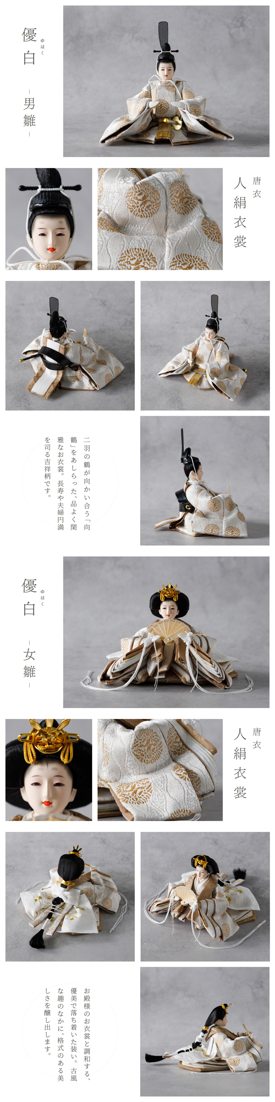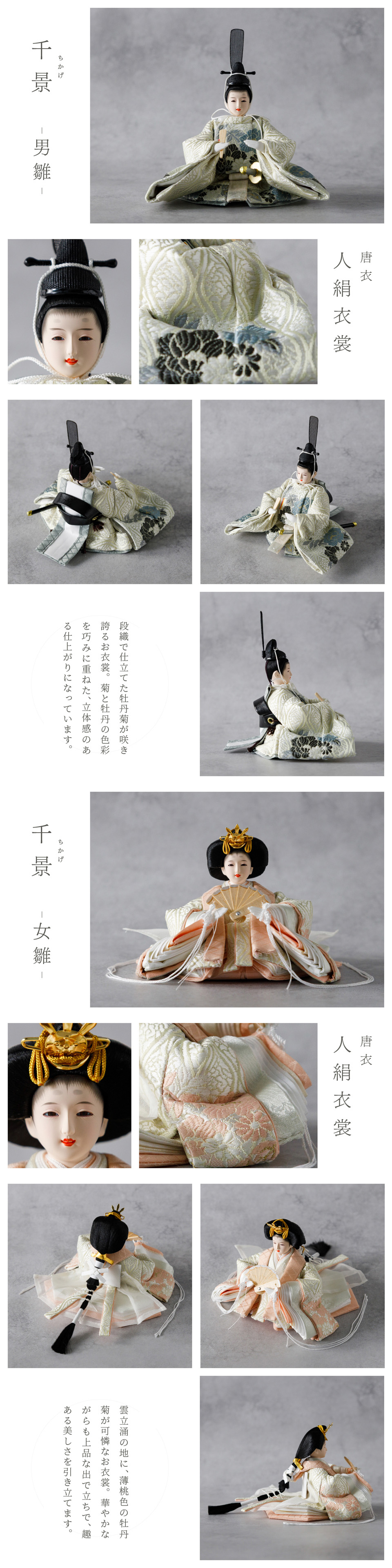 ※柄や色目の出方は個体毎に異なります。 ※職人手作りの為、個体差があります。 ※生産時期により仕様変更の可能性がございます。 例)主要箇所を除く生地・小道具類 ※生産工程上避けられないものは仕様です。 例)色ムラ・細かい生地のほつれなど ※パーツや接着部分などに、汚れのようなものが見受けられる場合がございますが、生産工程上、避けられない仕様となります。 ※お人形のお顔について、左右非対称・目の形の歪み・顔の塗装の凹凸などが見受けられますが、1つ1つ職人が手作業で制作しているため、予めご了承ください。 ※一部生地は、織り方の性質上、ほつれが出やすい仕様となります。不良品ではございません。