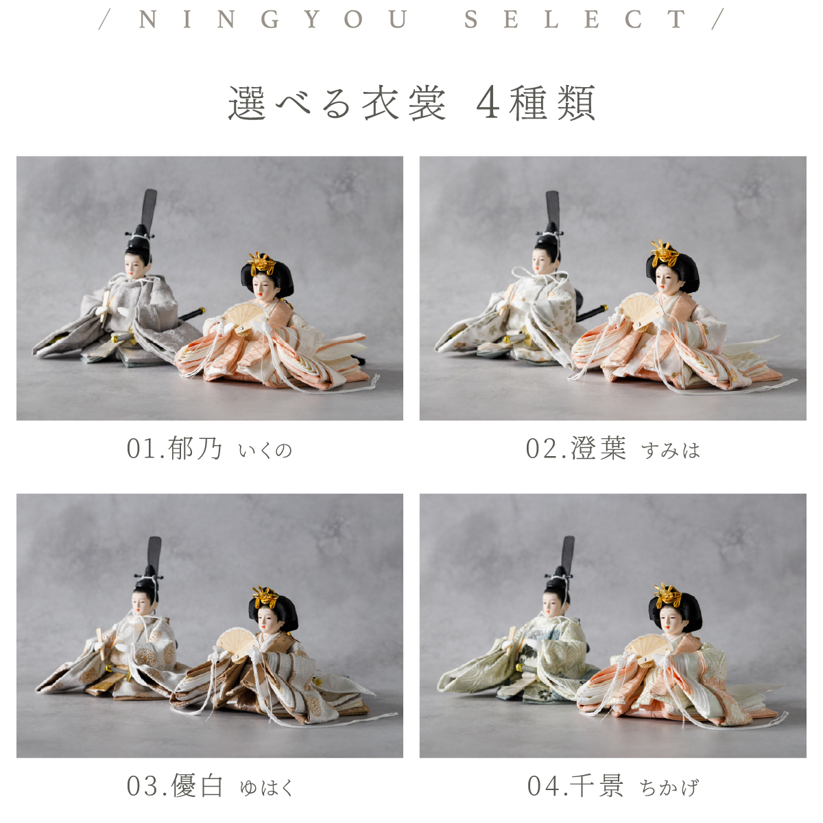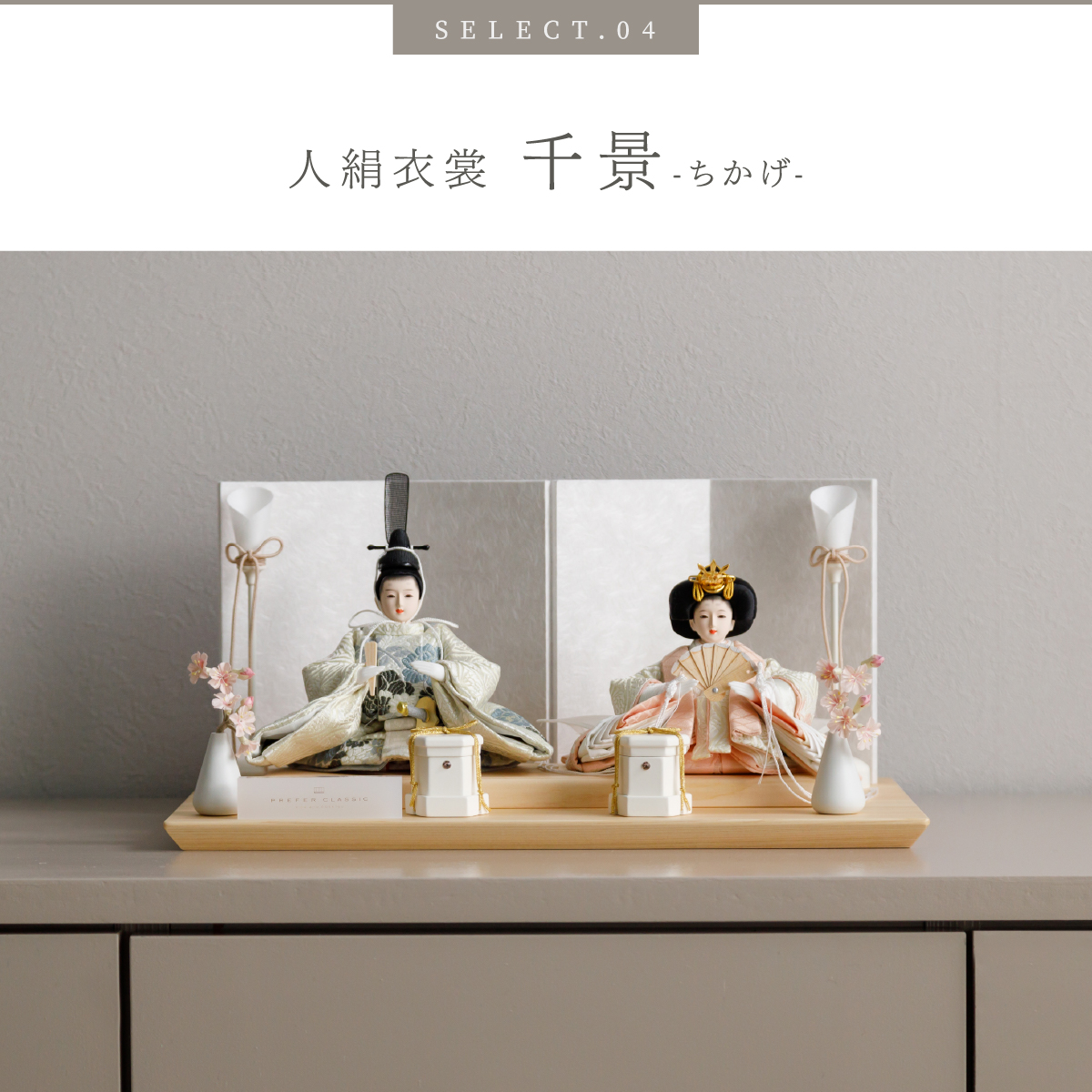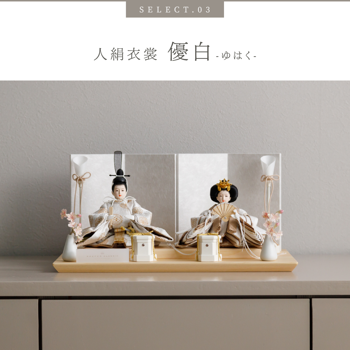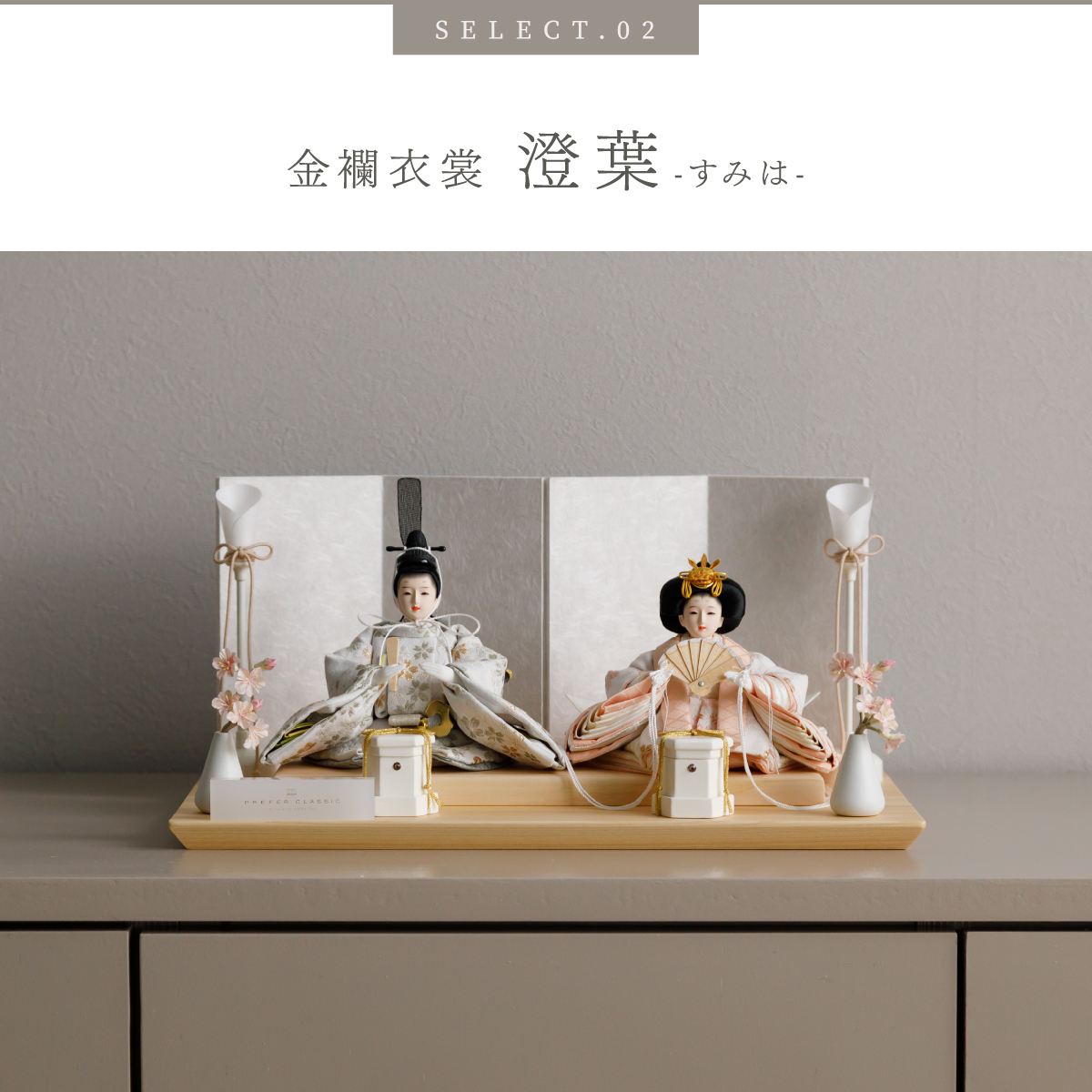 TOP > 雛人形 > サイズ奥行 > PREFER CLASSIC ひな人形 [檜台 白屏風 平飾り お道具付 貝桶 油灯 選べる道具2種類 枝桜ピンク 白梅 人形極々小サイズ 選べる衣裳4種類 澄葉 郁乃 優白 千景]