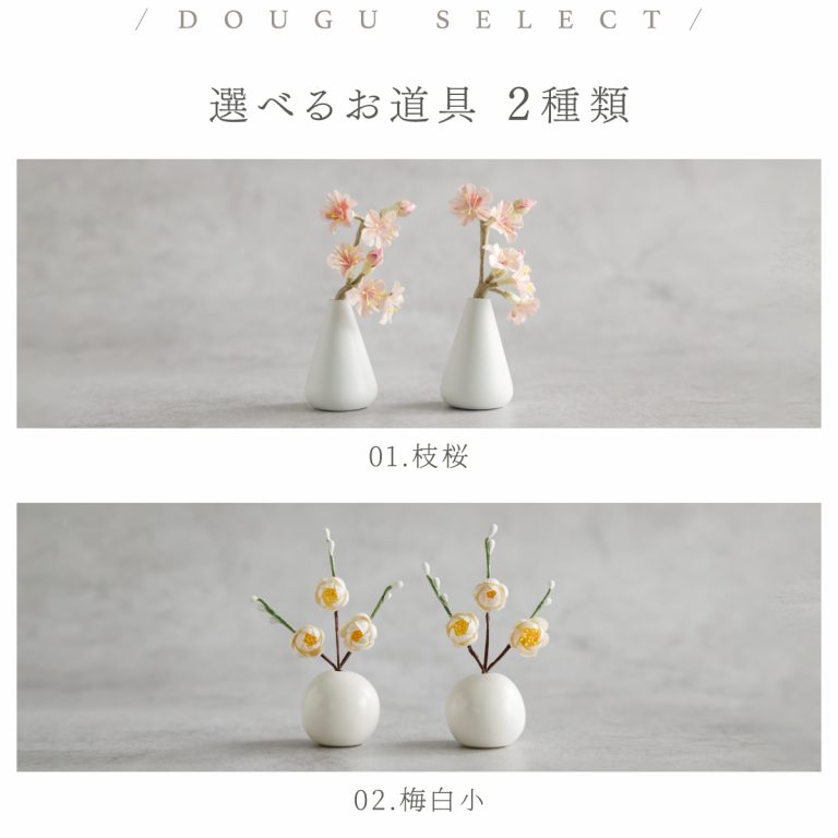 PREFER CLASSIC ひな人形 [檜台 白屏風 平飾り お道具付 貝桶 油灯 選べる道具2種類 枝桜ピンク 白梅 人形極々小サイズ 選べる衣裳4種類 澄葉 郁乃 優白 千景]