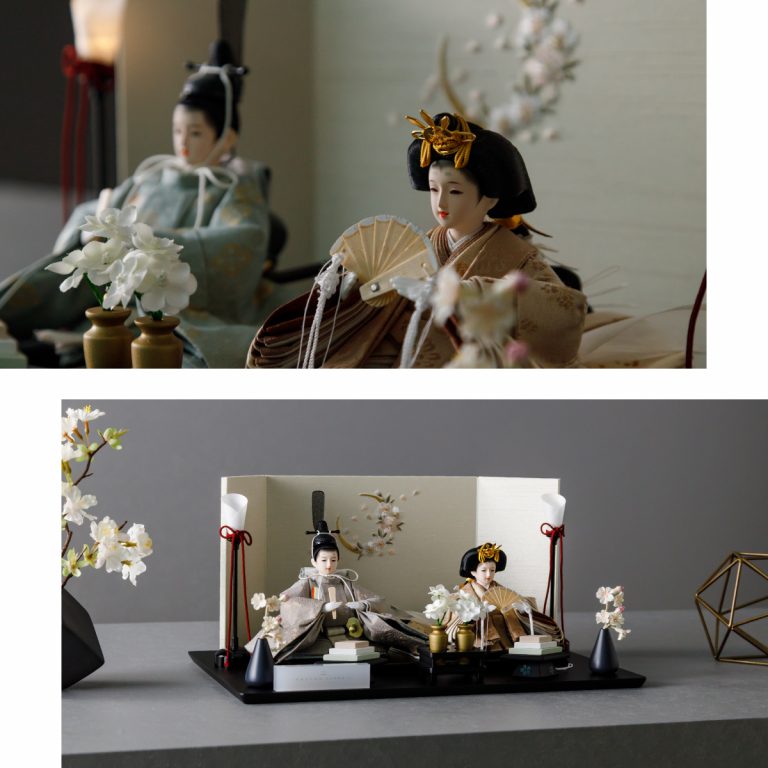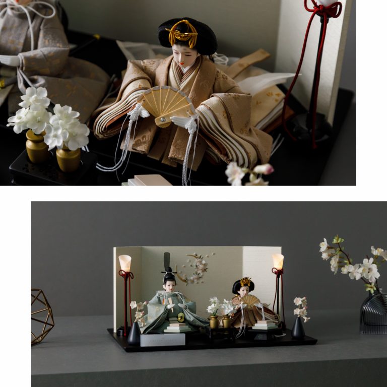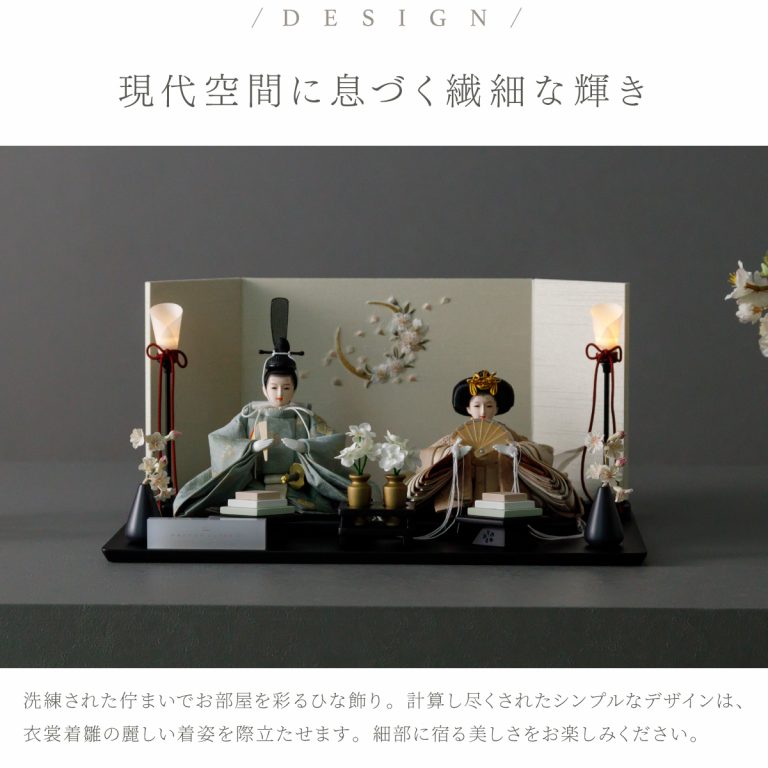 人形のお顔、飾り台、お道具まですべてにこだわり抜いて制作した、preferプロデュースの雛人形。熟練の職人たちがその技術を惜しみなく注いだ、本格派かつ高級志向のハイグレードなおひな様です。流行に左右されないシンプルモダンなスタイルのひな飾りは、時代を超えてどんな日の雛祭りにも華を添えます。衣裳着雛人形の美しい着姿を楽しめる親王飾り。かわいいお顔のお殿様とお姫様が優しく微笑みます。掌に収まるほどの極々小サイズ。どんな場所でも楽しめる大きさながら、凛とした存在感を放ちます。上品な艶と色合いが美しい綿織物のお衣裳は、おめでたい日の雰囲気をいっそう盛り上げてくれるでしょう。飾り台には主役のお人形が映える黒一色の台座を使用。繊細な刺繍を施した屏風と共に、ひな人形のお衣裳を引き立てます。平飾りタイプは組立ても不要でお手軽。繊細で美しいお道具もセットになり、華やかかつ豪華な雛飾りに仕上げました。雛人形を照らす可愛い油灯はコードレス式。女の子の初節句のお祝いやギフトにおすすめのおひな様です。