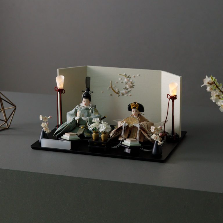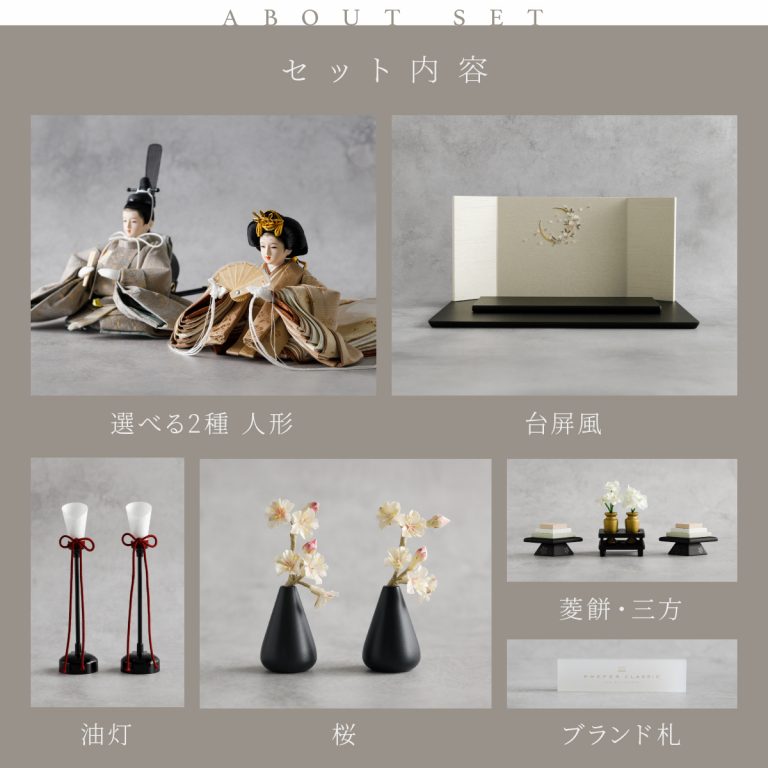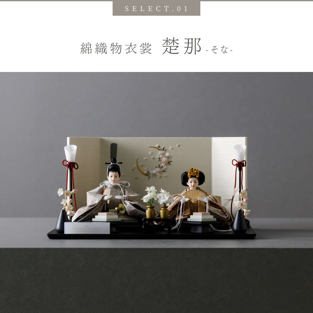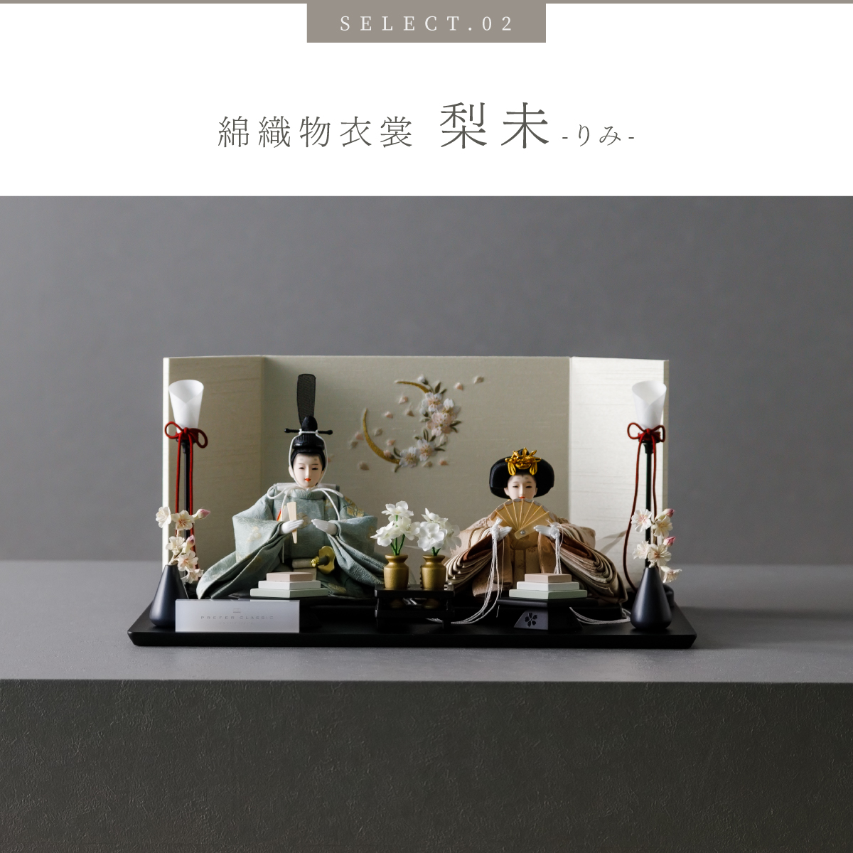 TOP > 雛人形 > ブランド > PREFER CLASSIC > PREFER CLASSIC ひな人形 [黒塗台 桜月刺繍屏風 平飾り お道具付 菱餅三方 油灯 枝桜白 人形極々小サイズ 選べる綿織物衣裳2種類 楚那 梨未]