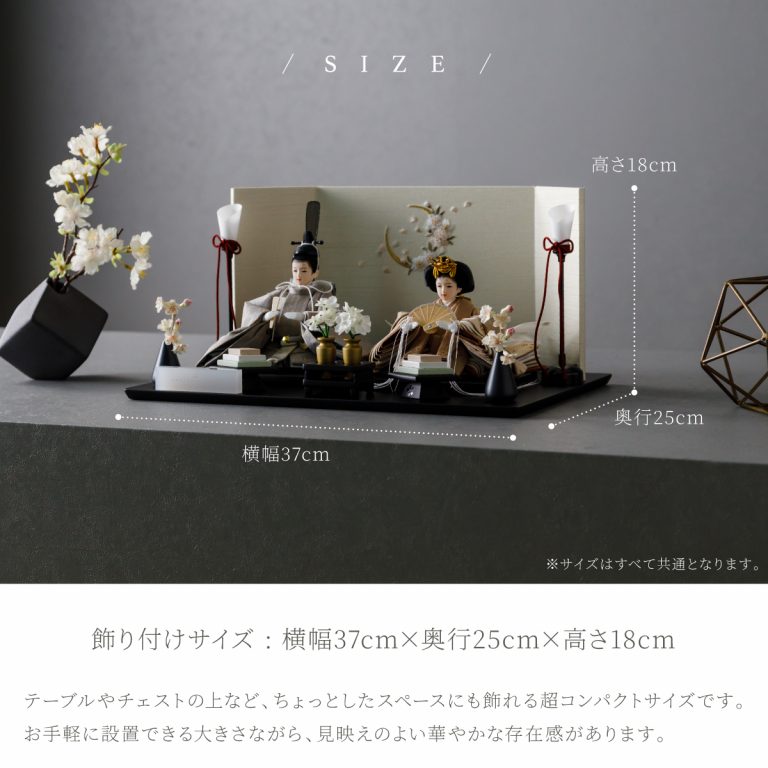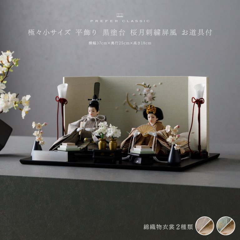 PREFER CLASSIC ひな人形 [黒塗台 桜月刺繍屏風 平飾り お道具付 菱餅三方 油灯 枝桜白 人形極々小サイズ 選べる綿織物衣裳2種類 楚那 梨未]