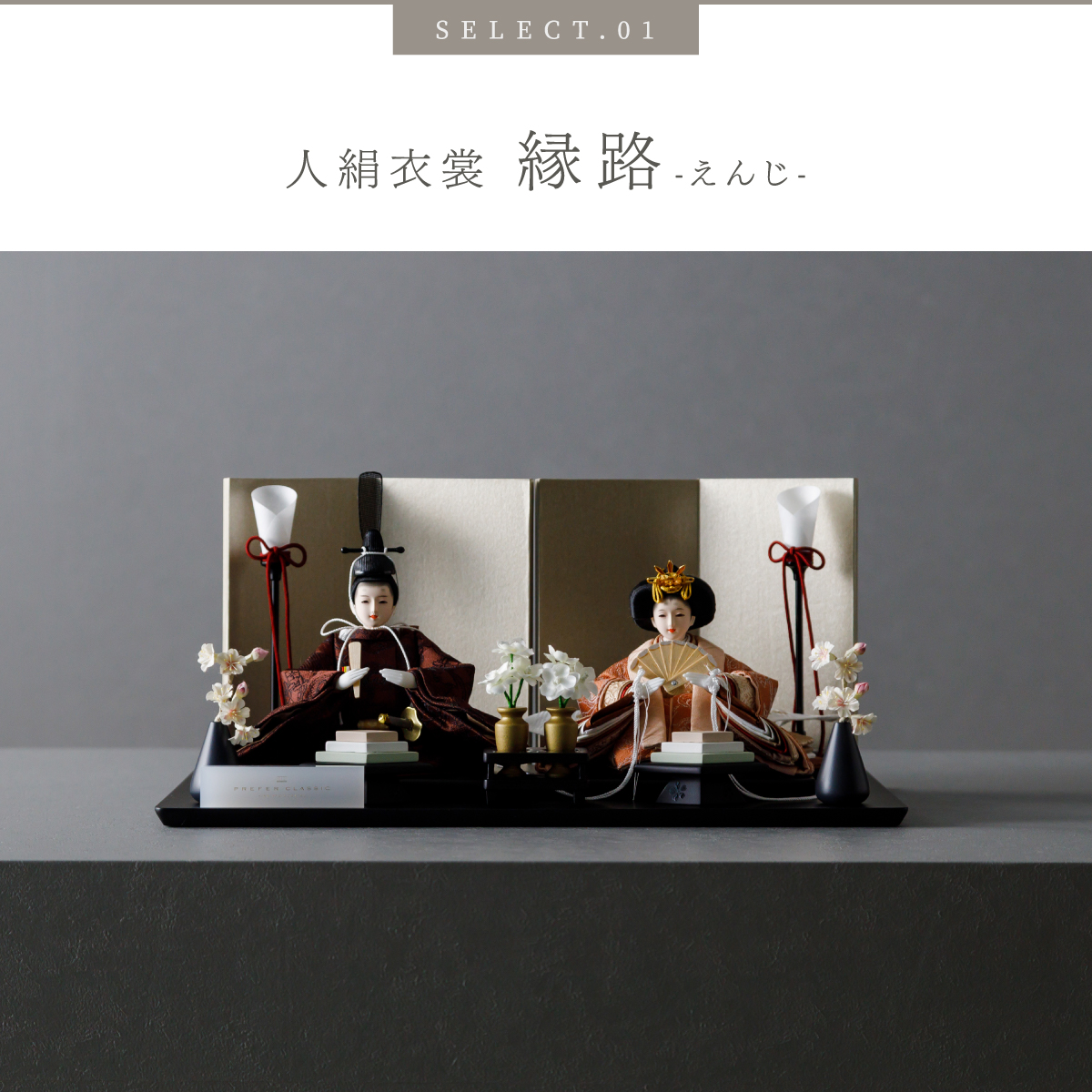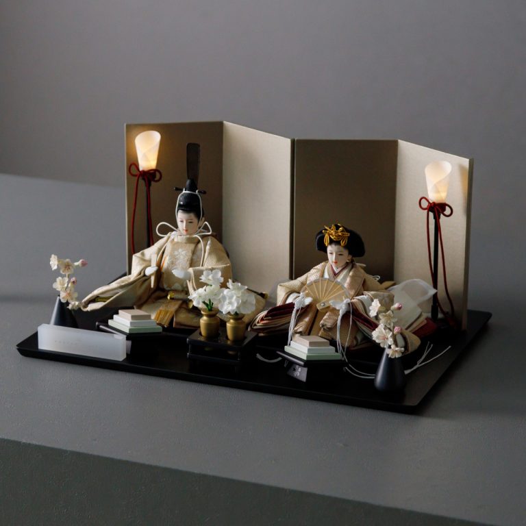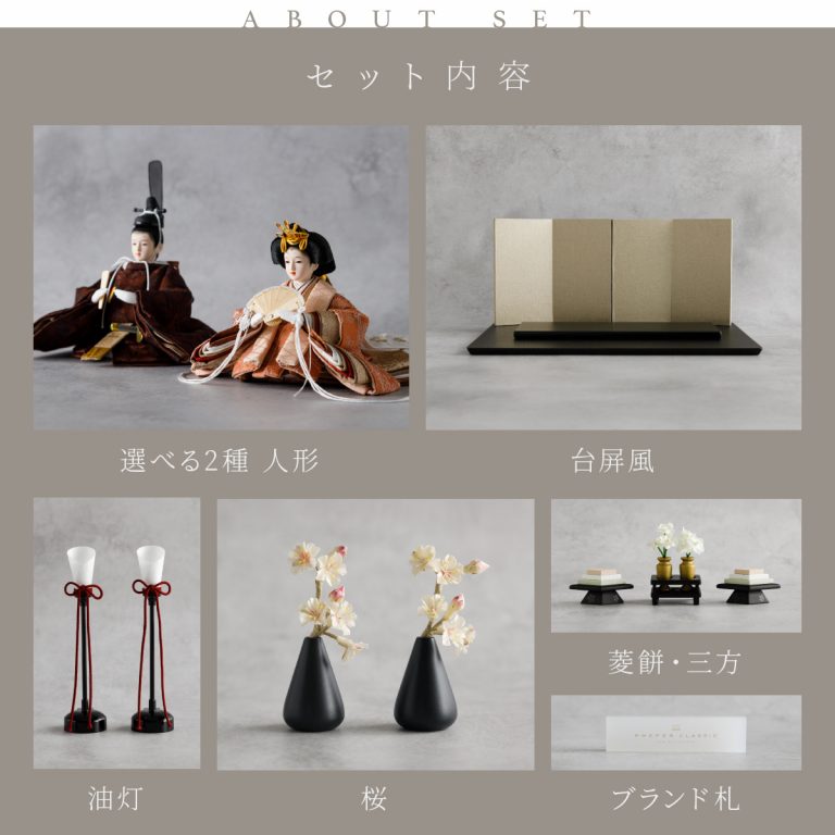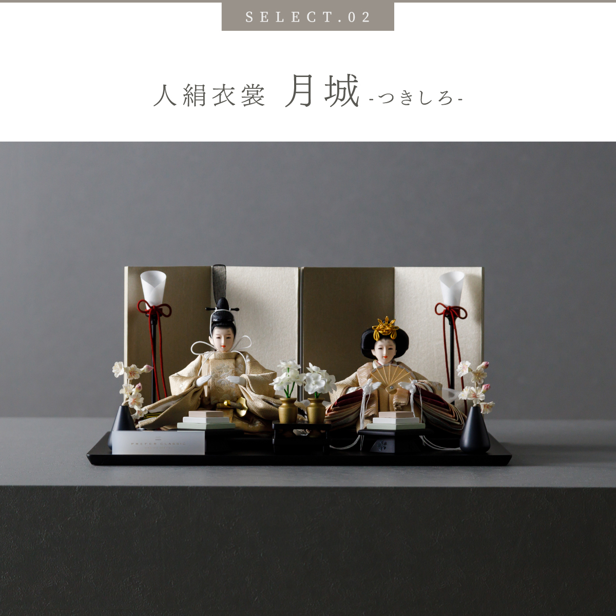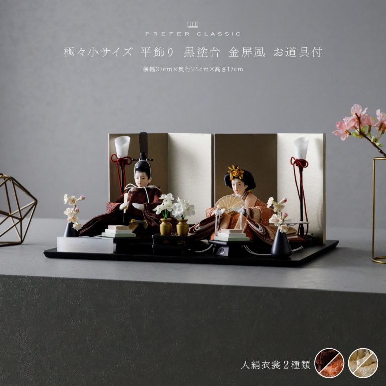 PREFER CLASSIC ひな人形 [黒塗台 金屏風 平飾り お道具付 菱餅三方 油灯 枝桜白 人形極々小サイズ 選べる人絹衣裳2種類 縁路 月城]