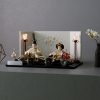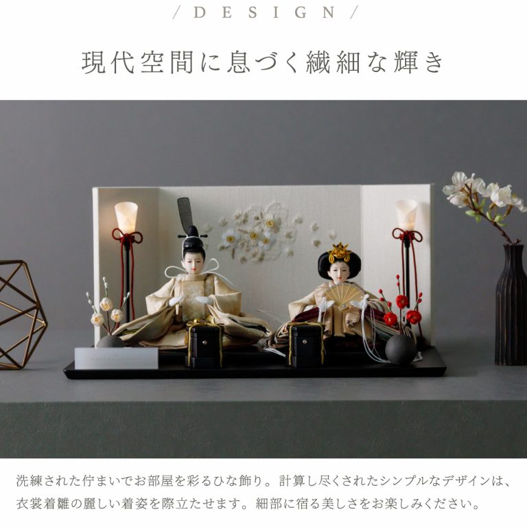 人形のお顔、飾り台、お道具まですべてにこだわり抜いて制作した、preferプロデュースの雛人形。熟練の職人たちがその技術を惜しみなく注いだ、本格派かつ高級志向のハイグレードなおひな様です。流行に左右されないシンプルモダンなスタイルのひな飾りは、時代を超えてどんな日の雛祭りにも華を添えます。衣裳着雛人形の美しい着姿を楽しめる親王飾り。かわいいお顔のお殿様とお姫様が優しく微笑みます。掌に収まるほどの極々小サイズ。どんな場所でも楽しめる大きさながら、凛とした存在感を放ちます。上品な艶と色合いが美しい人絹生地のお衣裳は、おめでたい日の雰囲気をいっそう盛り上げてくれるでしょう。飾り台には主役のお人形が映える黒一色の台座を使用。繊細な刺繍を施した屏風と共に、ひな人形のお衣裳を引き立てます。平飾りタイプは組立ても不要でお手軽。繊細で美しいお道具もセットになり、華やかかつ豪華な雛飾りに仕上げました。雛人形を照らす可愛い油灯はコードレス式。女の子の初節句のお祝いやギフトにおすすめのおひな様です。
