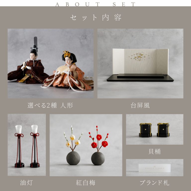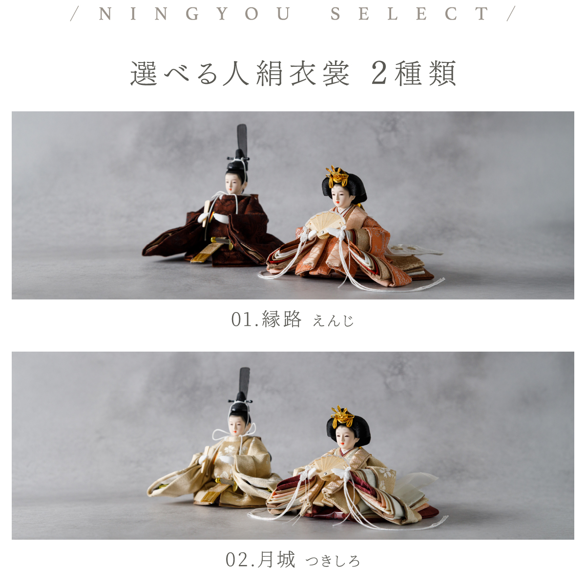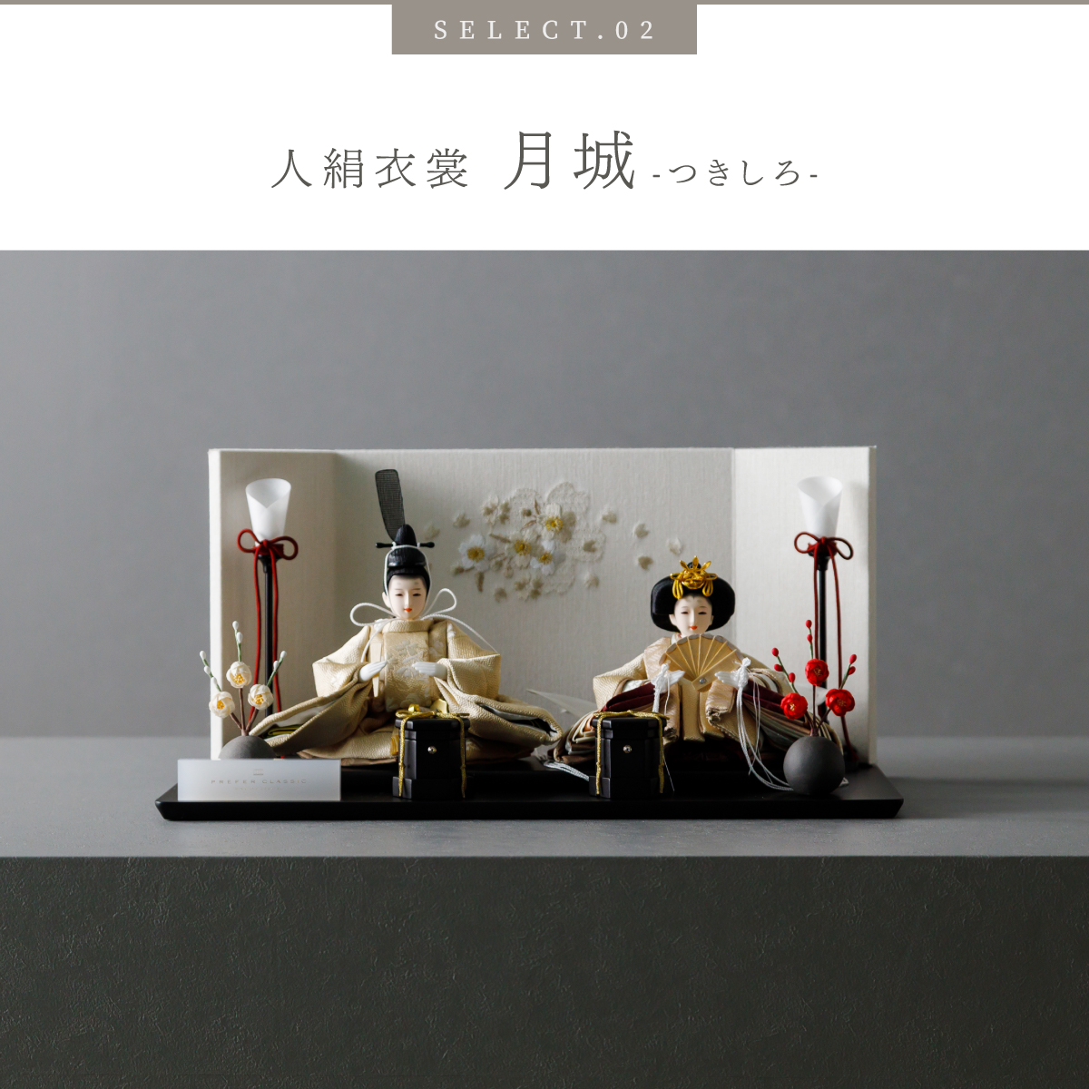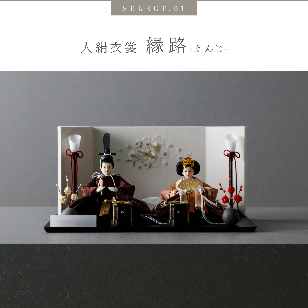 PREFER CLASSIC ひな人形 [黒塗台 桜霞屏風 平飾り お道具付 貝桶 油灯 紅白梅 人形極々小サイズ 選べる人絹衣裳2種類 縁路 月城]